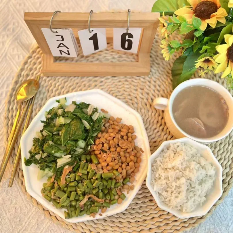 豆角粒炒肉、清炒小白菜