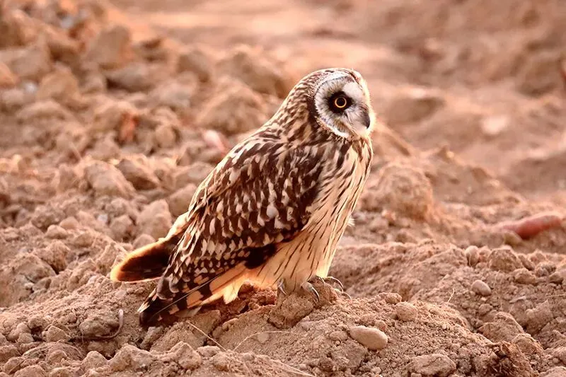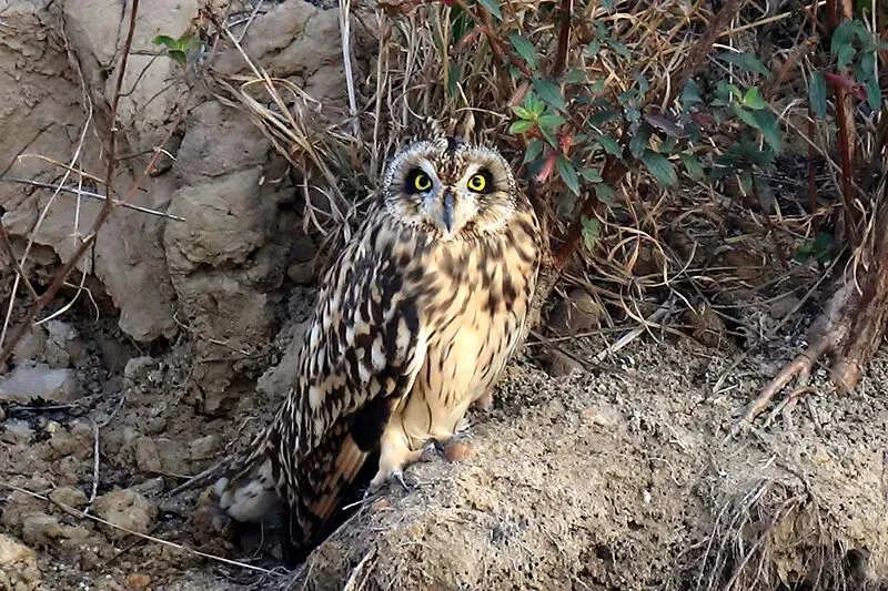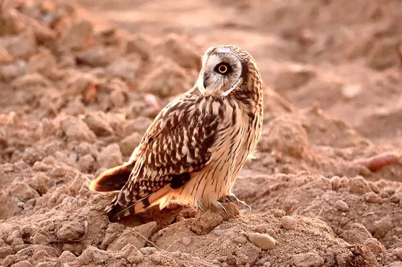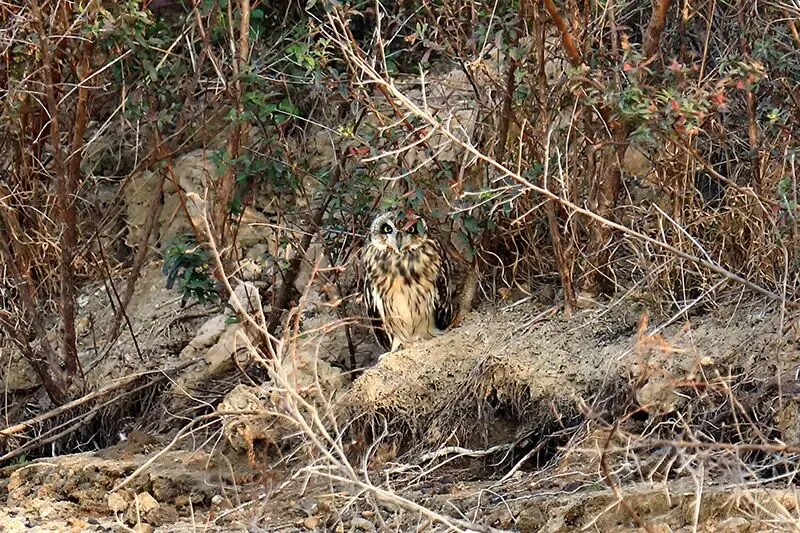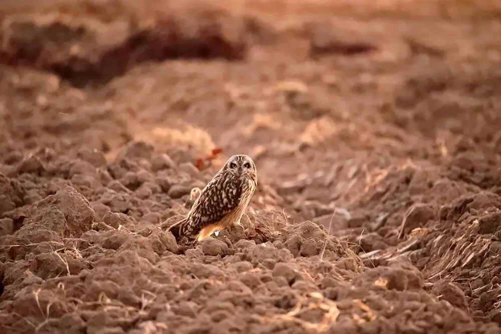 短耳鸮隶属于鸮形目鸱鸮科长耳鸮属,是一种中等体形的鸮类,国家二级保护动物。多在黄昏和晚上出没,白天也偶有活动踪迹,常见于开阔的田野或沼泽地带,以鼠类为主要食物,也会捕食小鸟、蜥蜴、昆虫等。这片区域恰好有一大片番薯地,毗邻鱼塘,正是其理想的栖息之所。后续几天,又在观鸟爱者在鱼塘基的水边发现其身影,更令人惊喜的是,观测到的短耳鸮共有两只,从体形特征判断,正是一雄一雌。