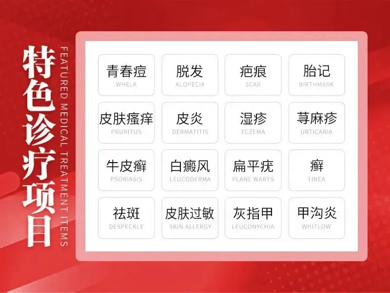 医院以中西医结合为特色,5 大门诊覆盖 30 余种皮肤病,从痤疮、湿疹等常见病,到白癜风、牛皮癣等疑难症,再到疤痕修复、祛斑等美容需求,实现 “专科专病专治”。