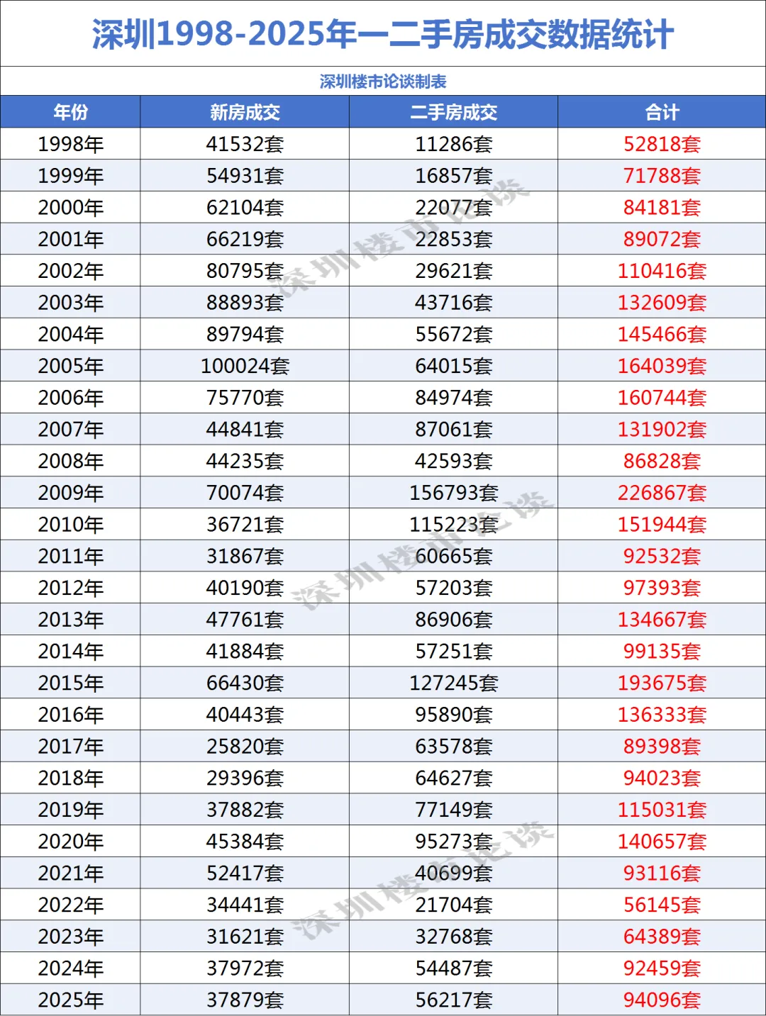 基于深圳1998-2025年一二手房成交套数的核心数据,结合房地产行业政策周期、城市发展基本面与宏观经济环境,可清晰梳理出深圳楼市从“增量开发”到“存量流通”的完整演变脉络,以及成交波动背后的核心驱动逻辑。