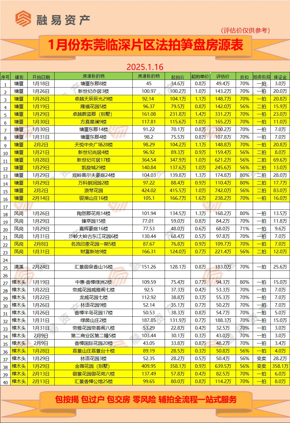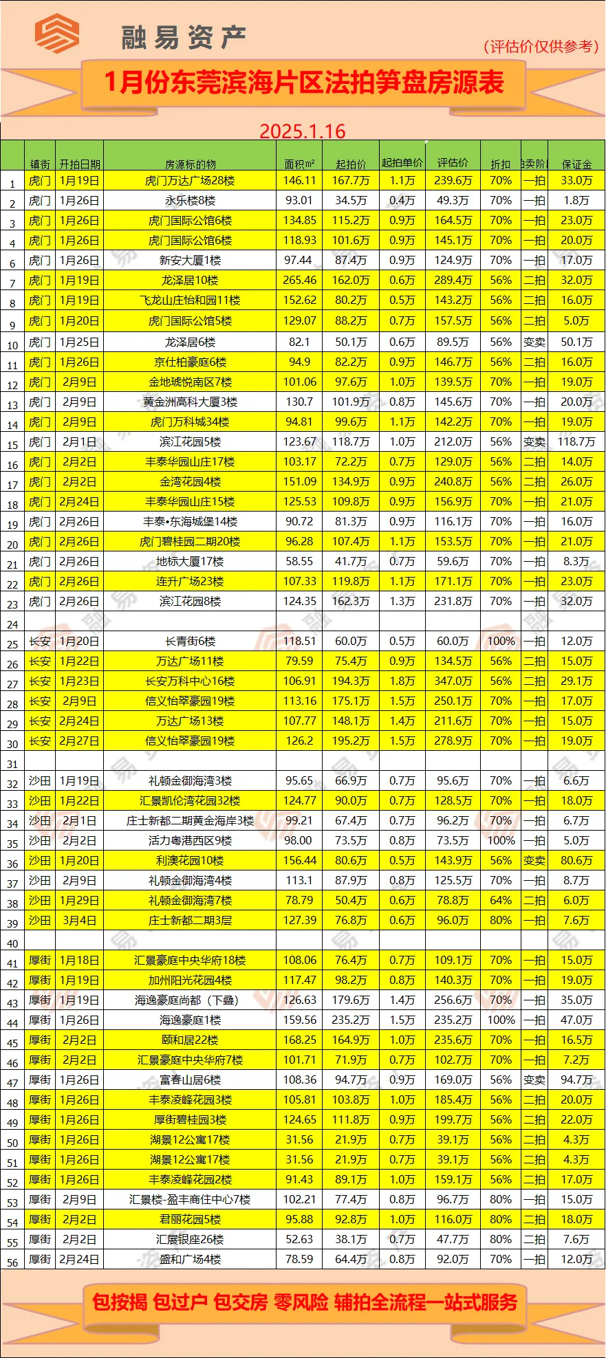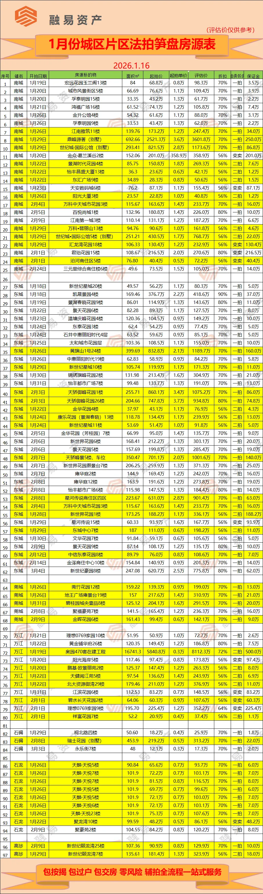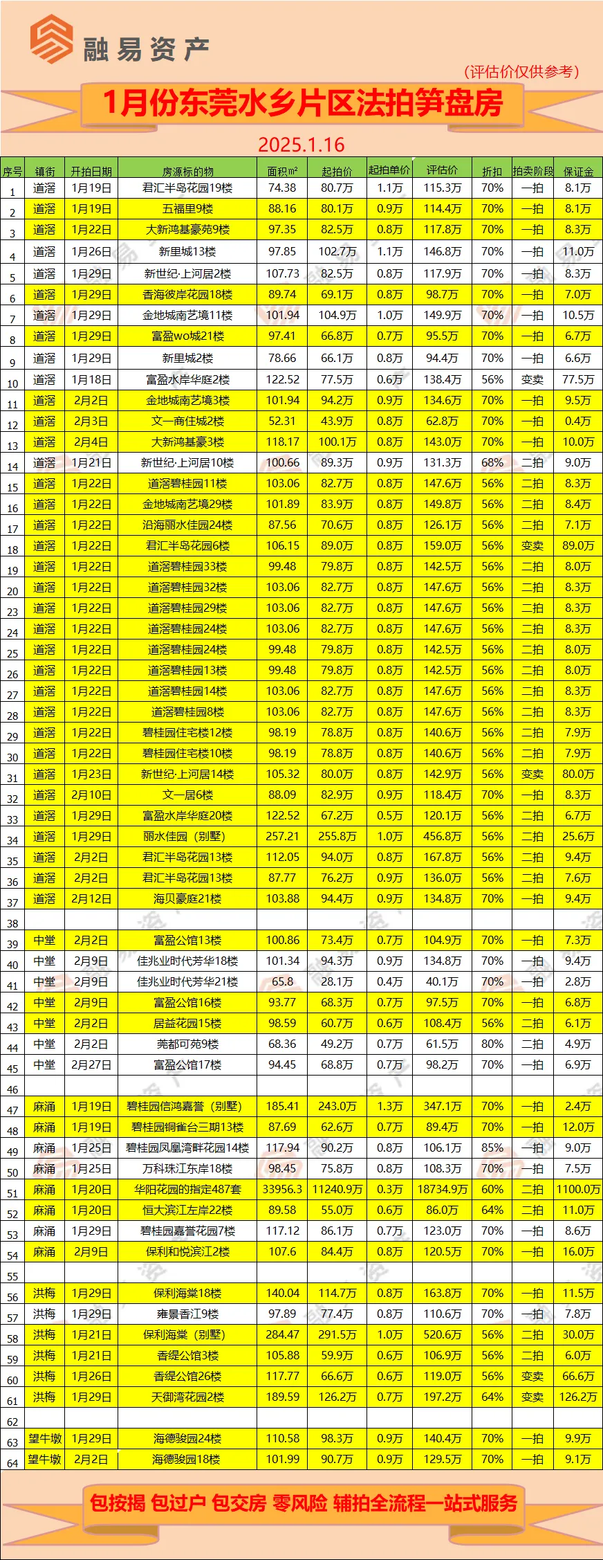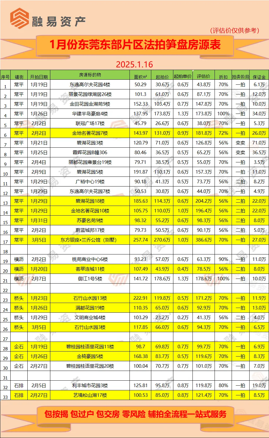 主城区,包括东城,南城,莞城,万江,石碣,石龙,高埗,前面4个是主城区,后面3个镇街是泛城区,笋盘用黄色标记。比之前有所减少,快春节了嘛松山湖片区,以松山湖为核心,周围包括有黄江,寮步,东坑,大朗,大岭山,茶山,共计7个镇区。东部片区,大头是常平,还有横沥,桥头,石排,企石,谢岗等临深片区,包括塘厦,凤岗,清溪,樟木头共4个镇区。滨海片区,包括虎门,沙田,厚街,长安4个镇区,笋盘用黄色标记。水乡片区,包括道滘,麻涌,中堂,洪梅,望牛墩,共5个镇区,笋盘用黄色标注。如果买法拍房,只需市场价8折,一套房随便就省几十万,并在此郑重承诺:
