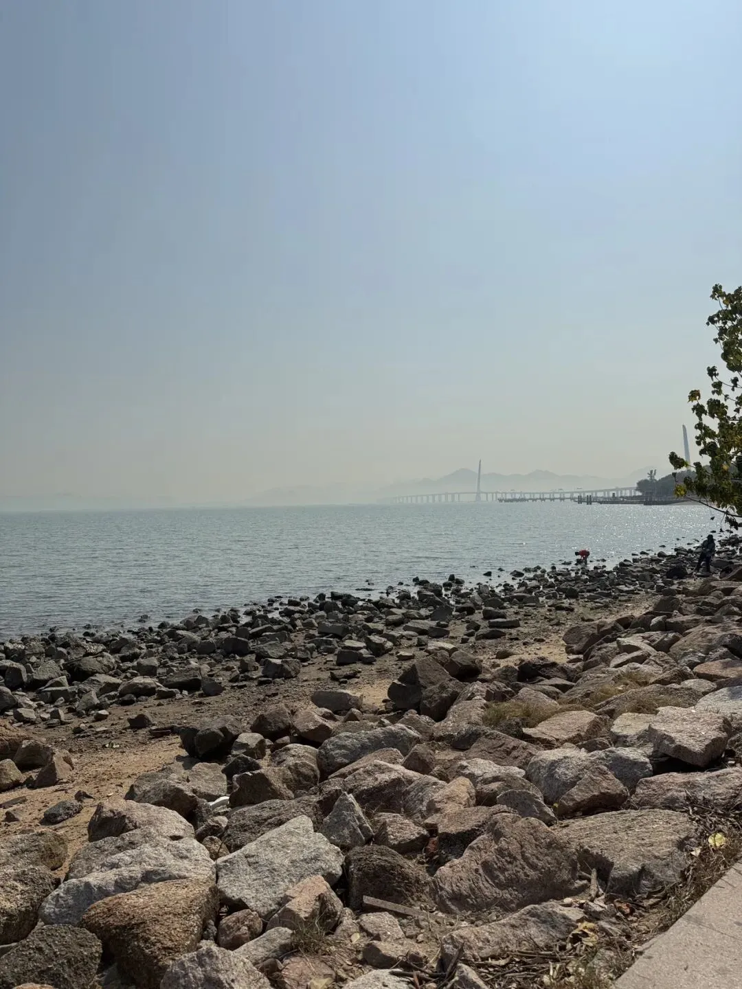 飞翔的海鸥以及远处的深港跨海大桥尤其是在日落时分,夕阳余晖洒在海面上,波光粼粼