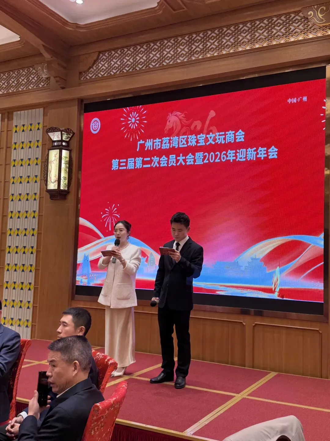 当晚,泮溪酒家张灯结彩,暖意融融。主持人广州佛珠缘玛瑙的旷琴与满堂珠宝的谭锦琛登场,以热情洋溢的开场白拉开年会序幕。“金蛇辞旧岁,骏马启新程!” 旷琴的话语点燃现场氛围,谭锦琛则代表商会向莅临现场的领导、荣誉会长朱洪江及全体来宾致以诚挚问候。