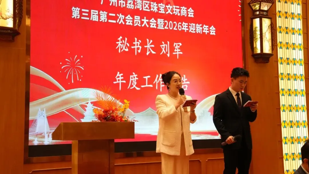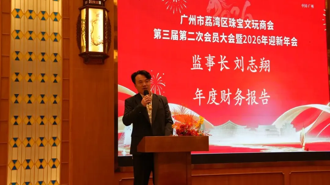 现场掌声雷动,共同迎接这场承载行业匠心与未来期盼的年度盛会。在全场嘉宾的见证下,主持人共同宣布:荔湾区珠宝文玩商会2025-2026年度年会正式开始! 商会的稳健发展,离不开核心团队的运筹帷幄与规范运作。会上,商会秘书长刘军作2025年度工作报告及2026年工作计划,用一串串详实的数据回顾了2025年的耕耘与收获,以清晰的规划勾勒出2026年的发展蓝图,让在场同仁对行业未来充满信心。
