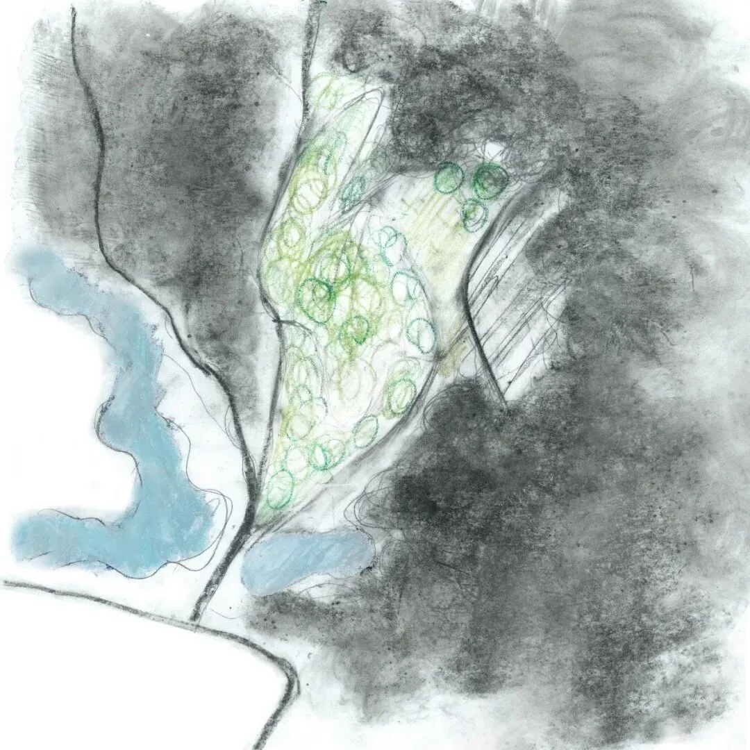 第一次的选址位于梧桐山恩上公园东北侧,有坡地与树林隔断,场地藏于内部树林包裹,进入场地需要通过一条小路进入,犹如“壶中天地”,地势较低,场地氛围幽静。四周自然植被良好,中间有一块空地。登山行此,颇有“行到水穷处,坐看云起时”之意。设计草图