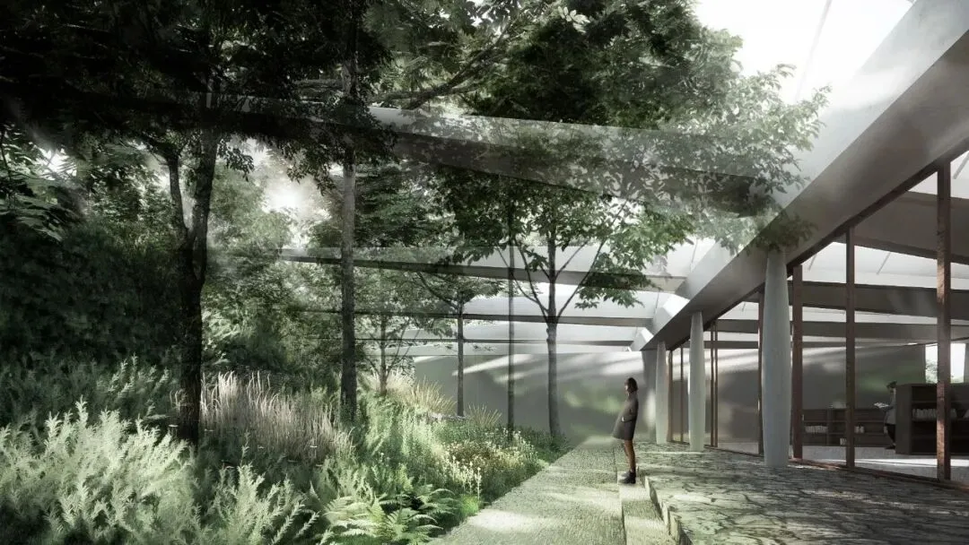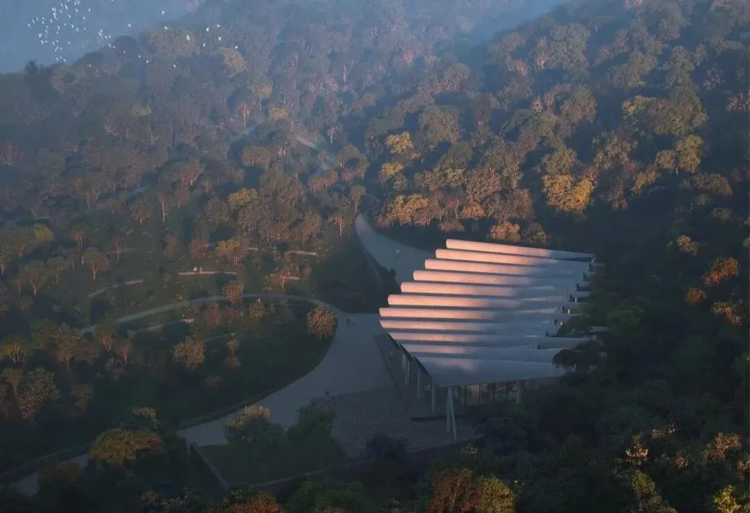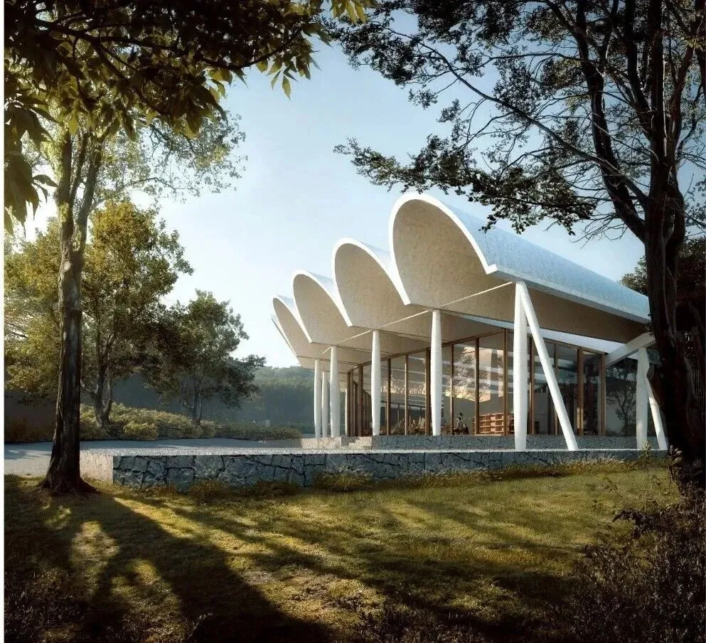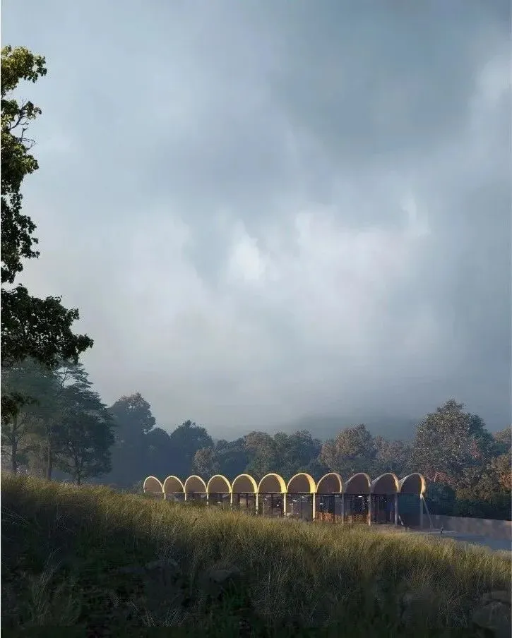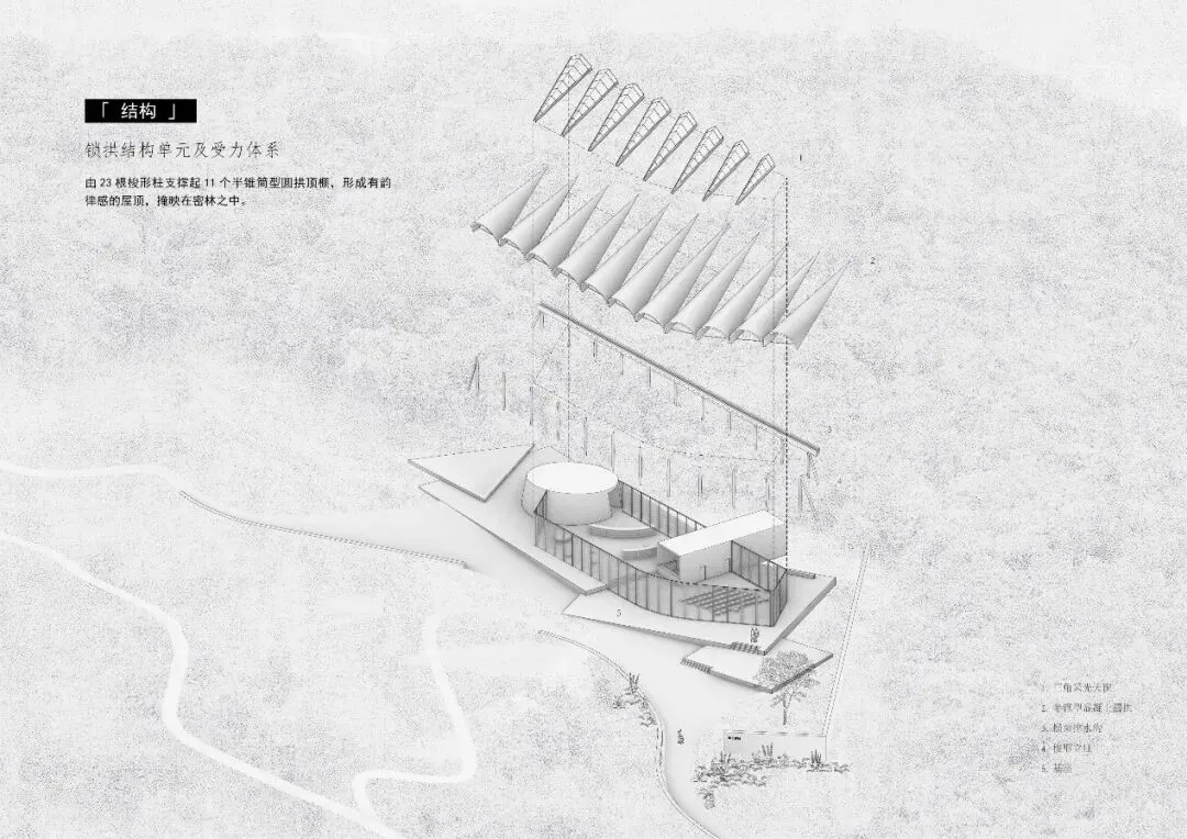从结构和场地高差向背特征出发,形成石砌的台座,区分出场地的领域,其中设置两个服务核,区分空间领域,生成流动开放自由的场所,后续的空间由使用者,运营方不断再定义的新建筑类型。屋顶为“梳”型平面,插入树林,西侧开阔的活动场地,东侧则形成隐秘安静的边院空间与自然对话。这是一种一半建筑,一半庭院的布局,形成大屋架对场地的覆盖,建筑与自然呈现交融\谦逊的半隐式架构。