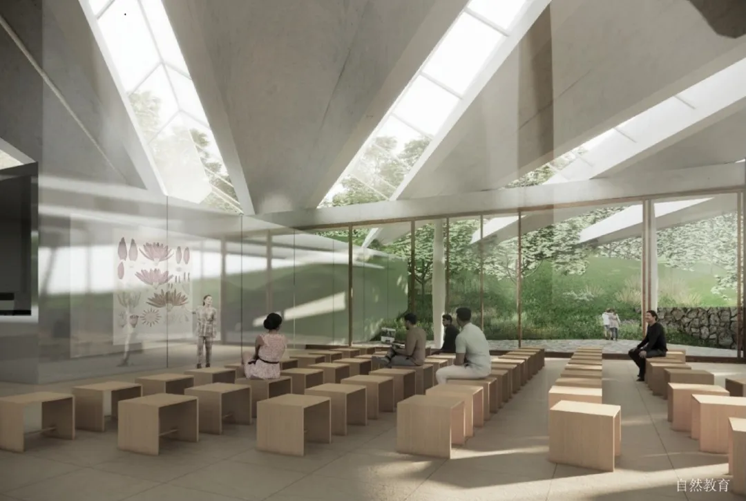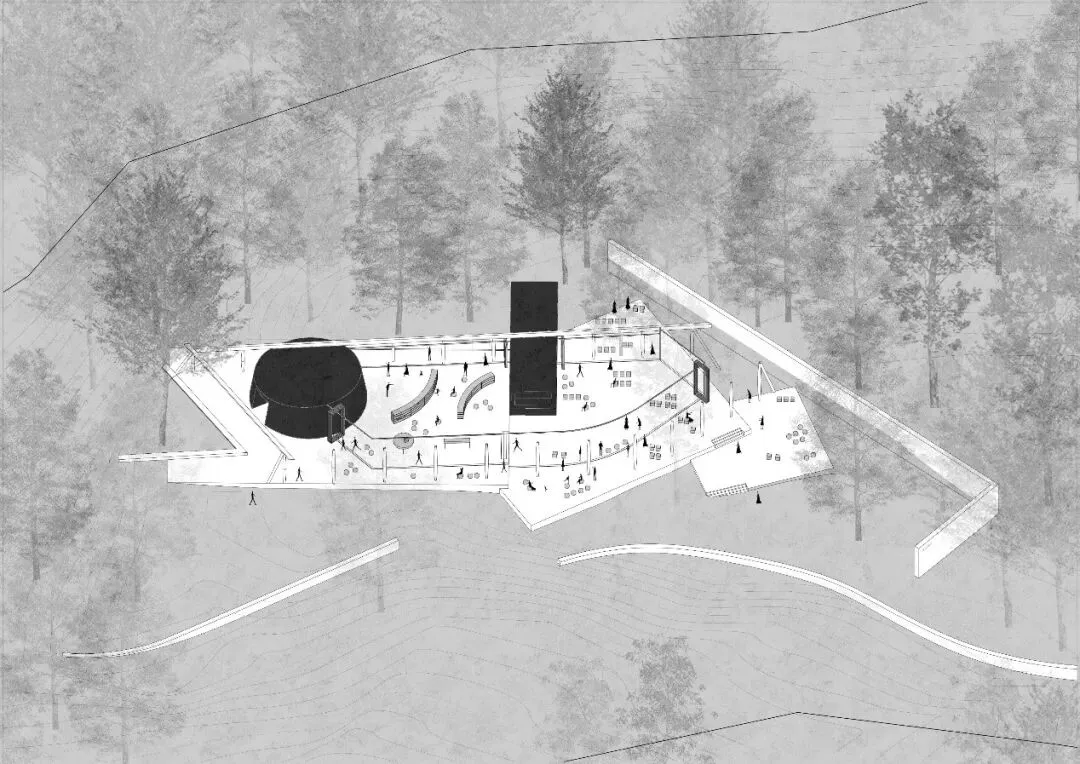它从入口树林的那片豁口开始,梳理可建设用地,保留树木,保留原有路径,新增连接可达,减少场地破坏,塑造由南至北的空间序列,顺应场地特征,由缓坡上升,矮墙引导,创造新的地方场所。