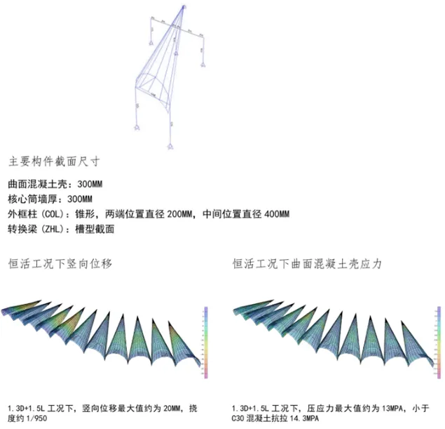 这个屋架采用拱锁结构单元及受力体系:由23根梭形柱支撑起11个半锥筒型圆拱顶棚,形成有韵律感的屋顶,掩映在密林之中。结构抗侧力体系主要由圆台型及矩形的两个核心筒组成,形成一个有利的抗侧力体系。另设置两排外框柱,用于支撑楼面。