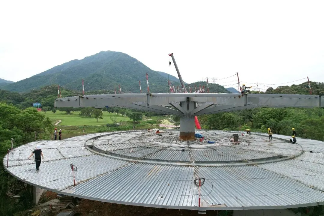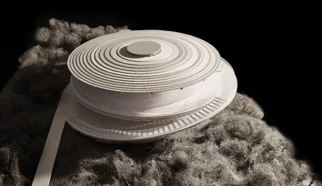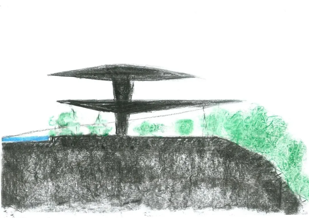 在新选的场地中,我们希望建筑的植入尽量少对自然的环境的影响,于是我们选择了一个 “伞状“的圆形钢结构结构类型:首层尽可能架空,屋顶和楼板由上、下由两个桁空腹架体系通过中间一根柱子支撑串联,让二层活动区周边不出现柱子,周边视线充分打开,360°全景视野。其中不上人屋顶,由16米半径伞状结构中柱支撑,二层的活动平台为主要人流活动空间,由半径19米的圆形平面构成,由中间中柱、悬挑段由圆形电梯筒,弧形楼梯三点支撑(其中弧形楼梯中段由斜柱支撑)。