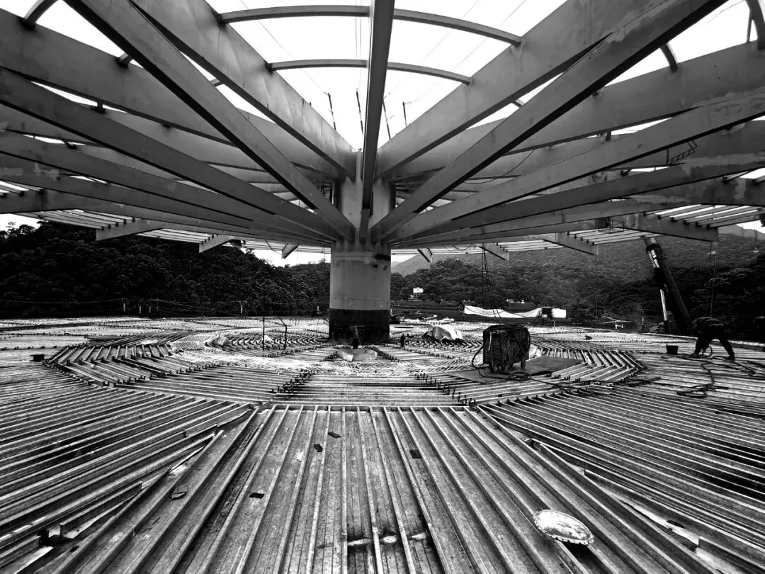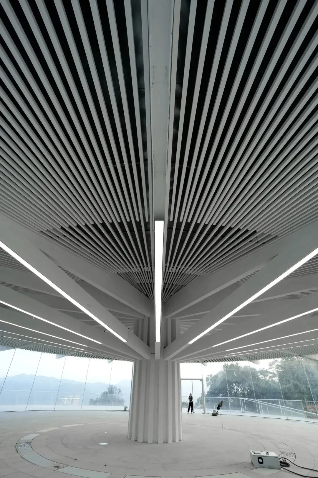 我们高度整合了设备与结构:合理利用二层楼板的变截面“结构空腔“,组织空调地面送风,排水,电等设备设置;屋顶圆心安置液压式可开启天窗,温度高时可把室内屋面的热空气排放出室内;合理利用屋架的工字钢凹槽,作为灯槽;周边玻璃采用单片弧形玻璃作为自身支撑,从而保证室内周边景观的通透感。二层屋顶考虑到有设备走线等问题,顺应主梁放射性平面采用白色格栅吊顶,实现”蒲公英“的空间意象。 钢结构杆件大小充分考虑工厂加工及运输的便利性,保证项目精度与经济性。施工视频 ©王照明