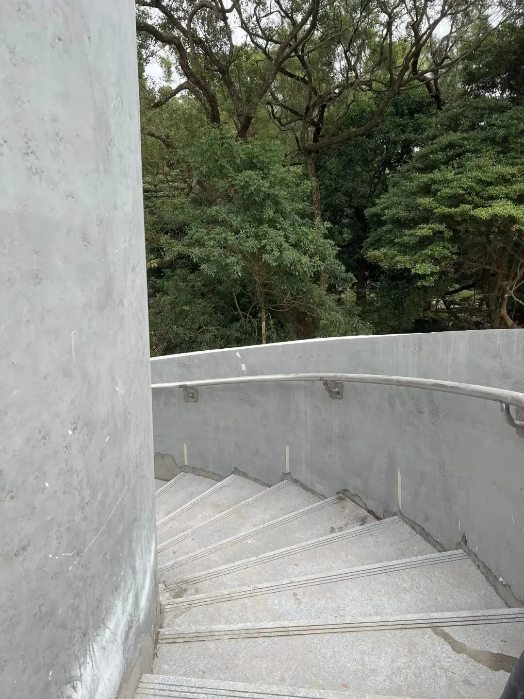 为了表现全景的视野,我们选择了圆形的平面:地面的圆形聚场,二层的圆形平台以及圆形的屋盖。三个半径不同的圆(分别是16米,13米,19米)定位在不同的圆心,围绕结构柱,相互错位, 形成不同的覆盖,空间呈现不稳定的动态感,其中对着海的一面户外平台最大,成为公众看海的观景台。单跑弧形楼梯通过旋转,视线从山转到树,最后转到海平面。卫生间、电梯、设备等服务空间放置北侧,结合地形半下沉,露出来的半截体量形成台阶与地面连接,围绕柱子,在首层形成有顶的半户外剧场。