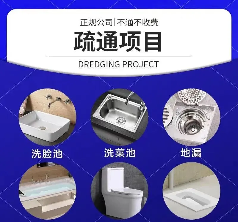 疏通下水道、马桶、蹲厕、地漏;疏通下水管;维修马桶漏水;维修水管;卫生间除臭、反味处理;脸盆、菜盆疏通;疏通墩布池;通坐便、蹲便、小便池;除尿碱;打捞贵重物品;疏通主管道、疑难管道、市政管道、工业管道;高压清洗车、抽粪车服务;上下水管安装、改管、维修