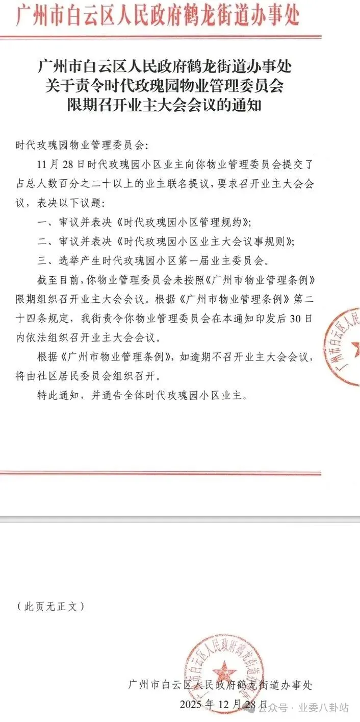 12月28日,广州白云区鹤龙街道办事处一纸通知,让时代玫瑰园成为广州罕见“被政府强制推上业委会轨道”的小区。由业主自发、媒体监督、职能部门多次发函,最终走到“行政责令”,时代玫瑰园业主们这条历时一年半的奋斗曲线,在广州基层治理史上留下鲜明印记。