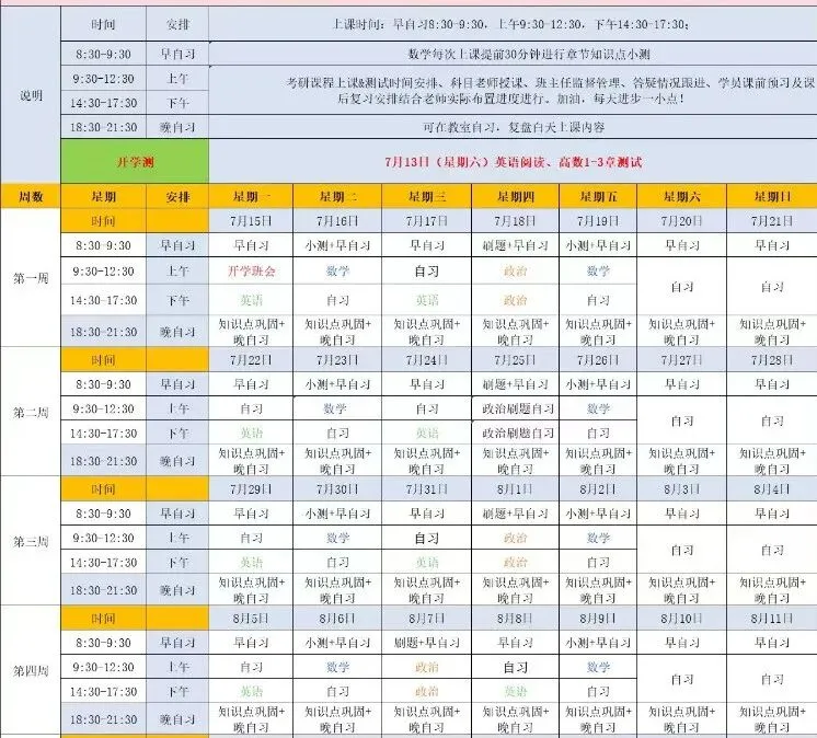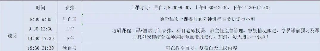 走读班每天都有很详细的课程安排,早自习+小测+上课+知识点巩固+答疑...,备考细化到分秒必争,让你每天保持高效复习和提升的状态。