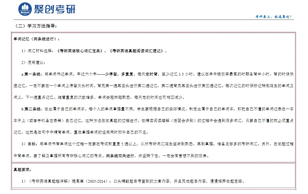 好的辅导资料等于成功了一半。我们全程为大家分阶段提供市面优质的辅导书籍和聚创考研内部高端教辅资料。比如英语词汇、英语真题讲义、数学习题集、典型重点题集、真题集、考试分析手册等等。