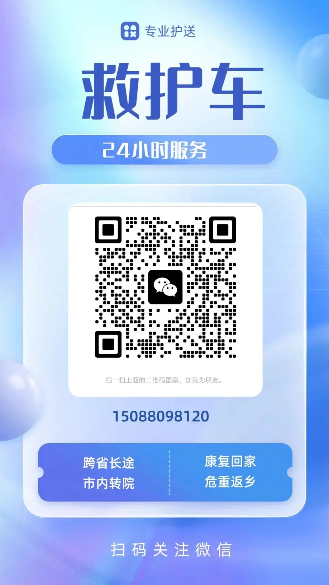 我们是救护车出租转运公司,120救护车接送病人预约护送。24小时为术后康复、危重患者及跨区域就医人群提供专业医疗转运服务,提供120救护车转运出租‖救护车转运‖私人120救护车(非急救)‖跨省长途转运‖危重病人转运‖市内转运‖术后康复病人转运‖高铁病人转运‖患者返乡‖大型活动赛事保障‖配备ICU设备:呼吸机▪心电监护仪▪吸痰器•微量泵•氧气▪急救药箱▪专业医护团队24小时服务热线:15088098120(←长按复制,微信同号)官方网站:http://www.120ajhs.com/