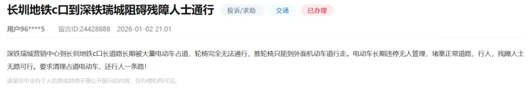 该街道办事处也表示,长圳地铁站出入口周边非机动车停放需求旺盛。“尽管街道每日开展常态化巡查、引导与整治,但仍存在部分市民为赶乘地铁随意停放车辆的情况,对行人尤其是残障人士通行造成影响。”