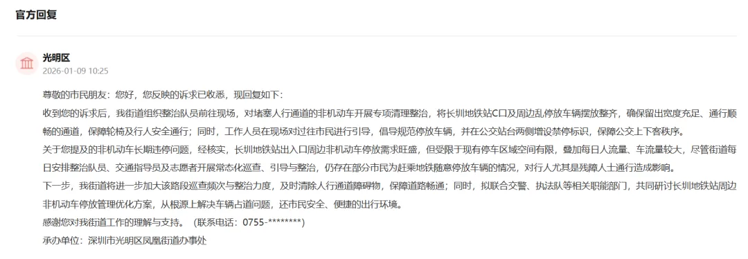 对此,深圳市光明区凤凰街道办事处回应,收到网友诉求后,组织整治队员前往现场,对堵塞人行通道的非机动车开展专项清理整治,将长圳地铁站C口及周边乱停放车辆摆放整齐,确保留出宽度充足、通行顺畅的通道,同时在现场倡导规范停放车辆,并在公交站台两侧增设禁停标识,保障公交上下客秩序。