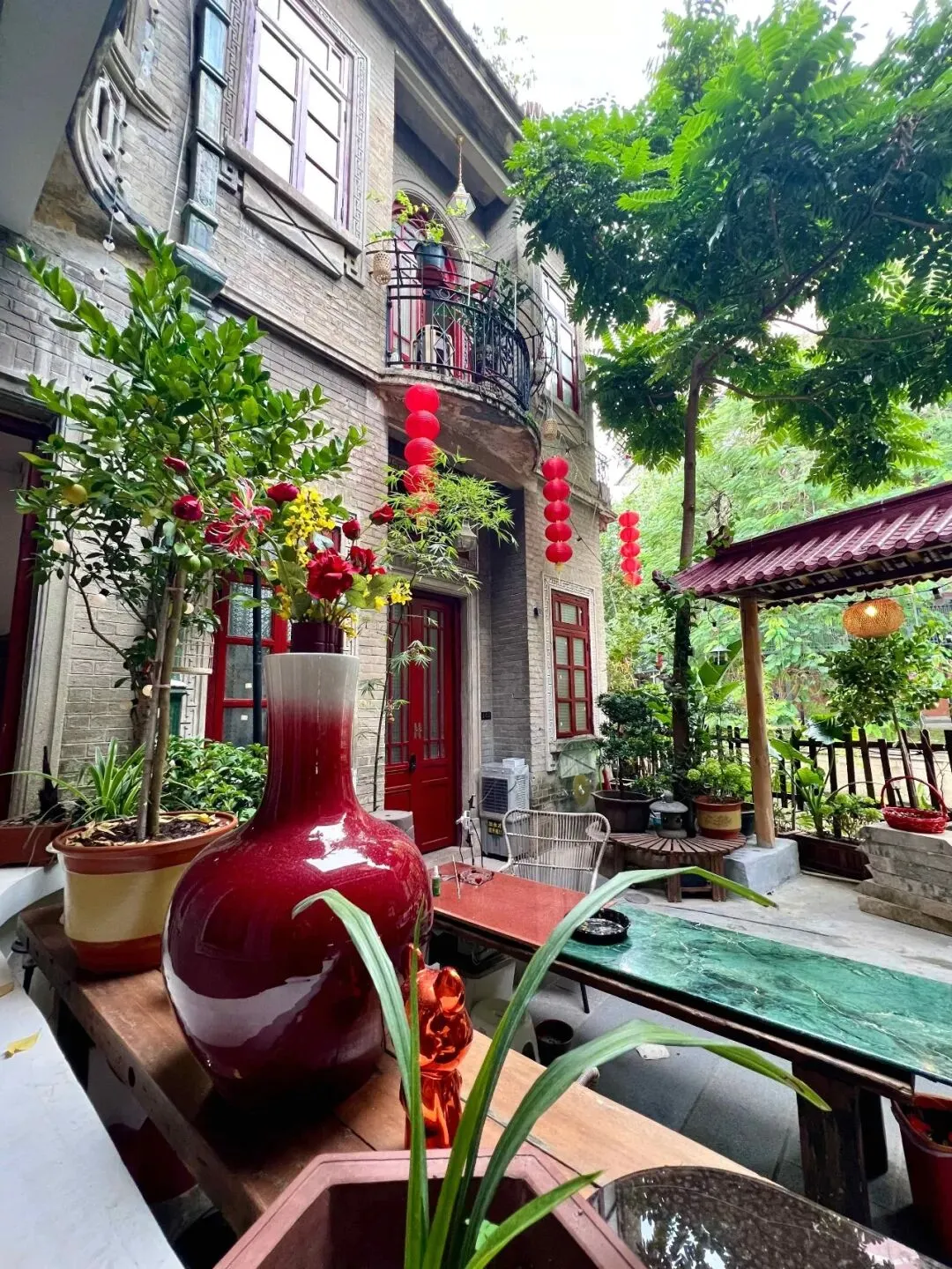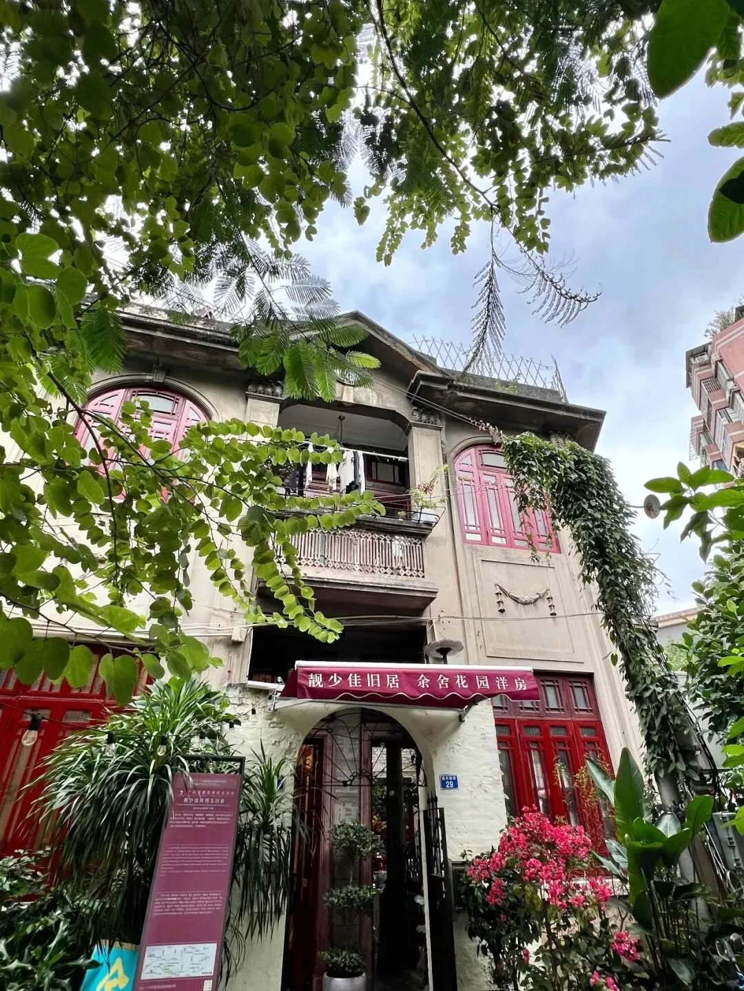 向南临水而居的昌华新街27、29及29号之一民居,是粤剧演员靓少佳夫妇的旧居,他们1952年买下29号用于自住,2011年9月公布为广州市荔湾区文物保护单位。今日虽不知屋主换了何人,但从洞开的大门望进院落,郁郁葱葱的绿植与纷纷扰扰的花卉映衬着百多年前的青砖建筑,审美依然在线……