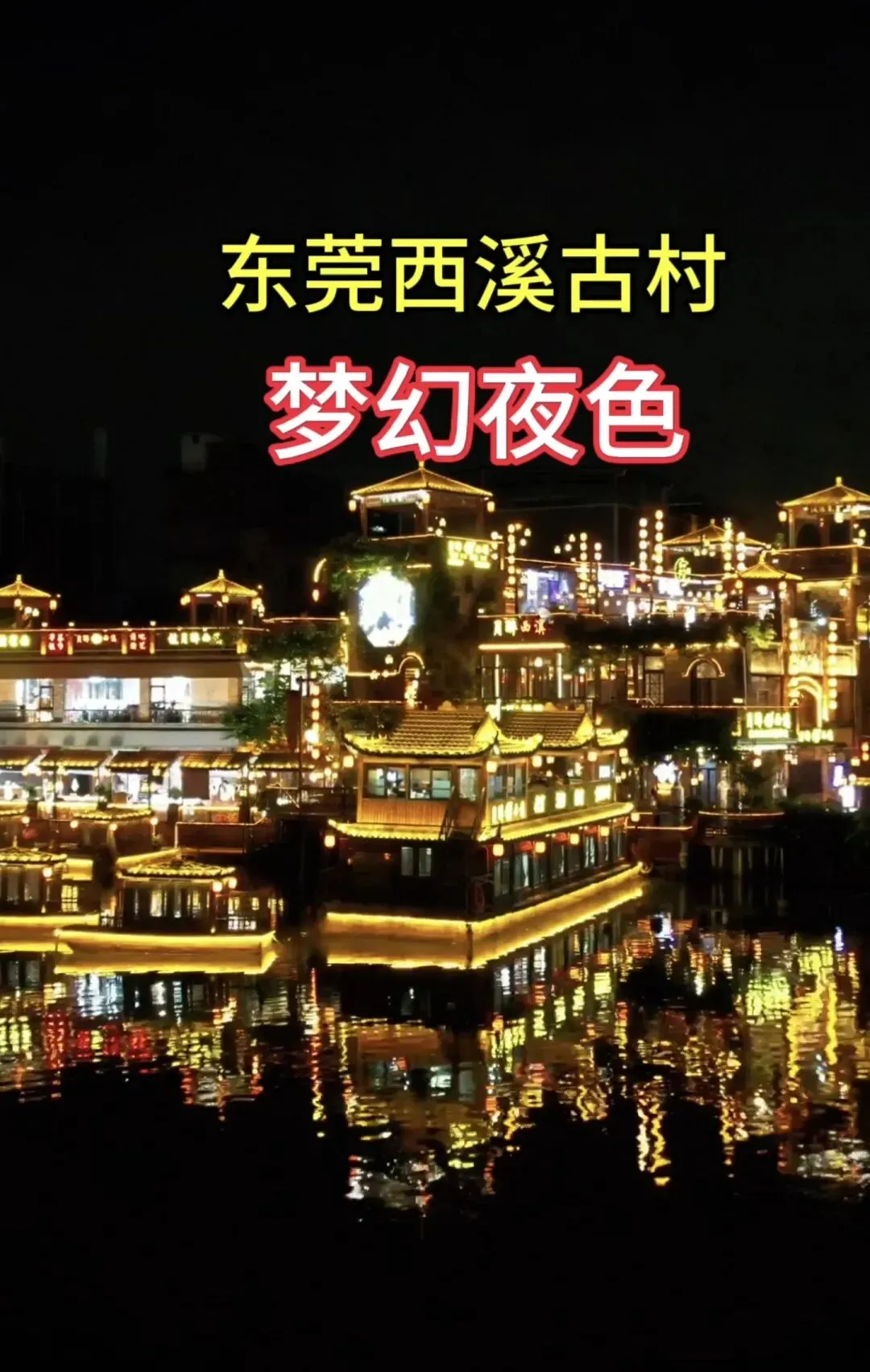 青砖灰塑的镬耳屋群在暖黄灯光中苏醒,飞檐翘角被灯带勾勒出灵动轮廓,像极了一幅立体的工笔画。被称为"东莞版洪崖洞"的大福楼层层叠叠,灯火辉煌,与水中倒影相映成趣,随手一拍都是大片。中心池塘的水幕光影最为动人,荷花灯随波摇曳,游船划过鎏金水面,揽月桥上的游人身影与倒影交叠,恍如《梦华录》中的场景重现。
