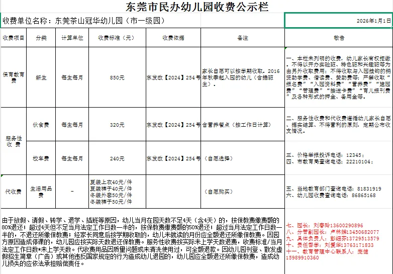 为了让大家更清楚地了解幼儿园收费标准,我园依据东莞市《关于加强学校教育收费公示管理工作的通知》、《东莞市发展和改革局 东莞市教育局 东莞市财政局关于规范我市幼儿园收费管理的通知》东发改〔2024〕254号的相关规定,现将我园2026年春季入学收费标准公示如下: