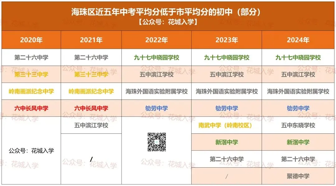 五中:五中滨江学校、五中东晓学校,海珠外国语实验附属学校、第二十六中学,聚德中学;南武:南武中学岭南校区(原岭南画派纪念中学)、第三十三中学(现南武第二实验学校);