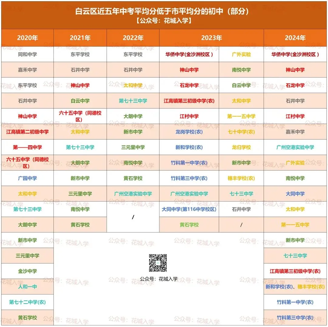 华侨:华侨中学(金沙洲校区);广外实验:广外实验、太和中学、第一一五中学、龙归学校、七十中学(农)、穗丰学校(农);六十五中:神山中学、石龙中学、江村中学、六十五中学(同德校区)、江高镇第三初级中学(农)、江高镇第二初级中学、一一四中学;白云中学:南悦中学、白云中学、新市中学、大朗中学、三元里中学、黄石学校、金沙中学;大同中学:大同中学、龙岗学校(农)、新和学校(农)、竹料第一中学(农)、竹料第三中学(农)、广园中学、大同中学(第116中学校区);