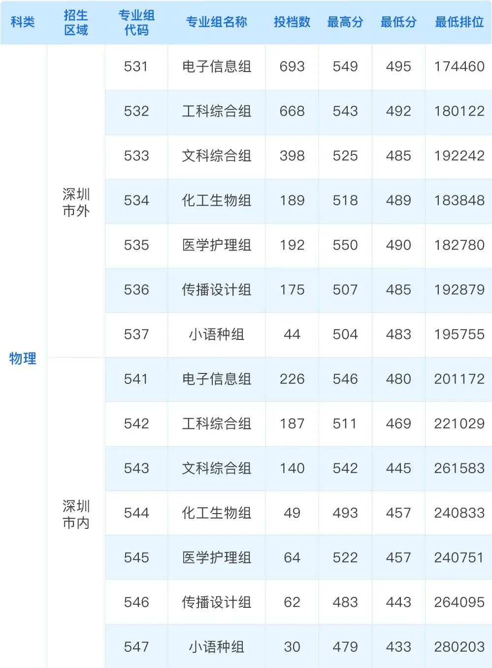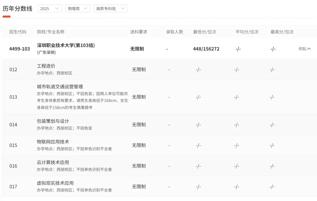 在广东,2025年专科批物理类投档最高分为550分,投档最低分为433分;历史类投档最高分为549分,投档最低分为459分。具体如下图所示(上下滑动查看):