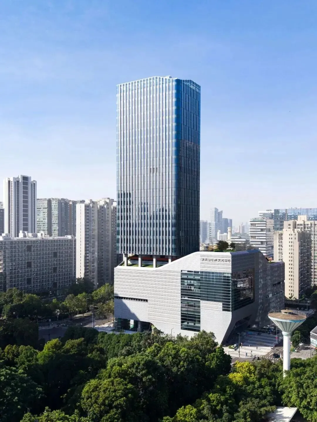 龙华区重点民生工程,涵盖大剧院、群艺馆、图书馆,是一个高品质公共文化体验新空间。项目占地面积约4.8万平方米,总建筑面积达18.4万平方米,整体建筑分为地上四层、地下二层,由北向南依次布局大剧院、群艺馆、图书馆。