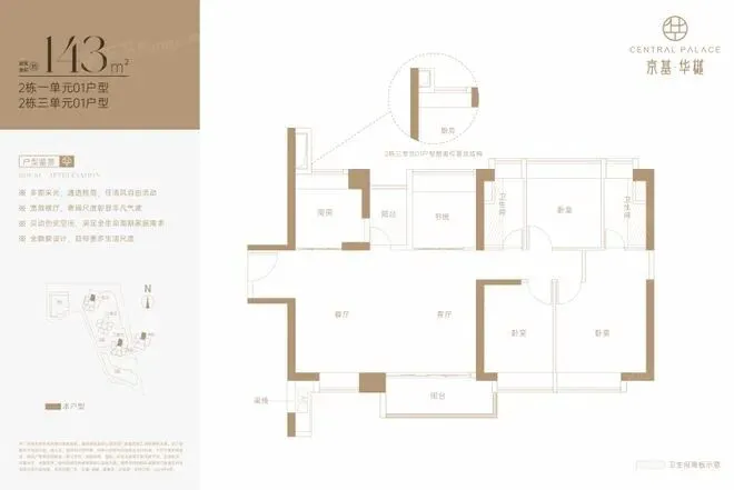 项目户型包括95㎡的3房2厅2卫、99㎡的3房2厅2卫、111㎡的3房2厅2卫、120㎡的3房2厅2卫、143㎡的4房2厅2卫及153㎡的5房2厅2卫,143㎡四房为横厅设计。