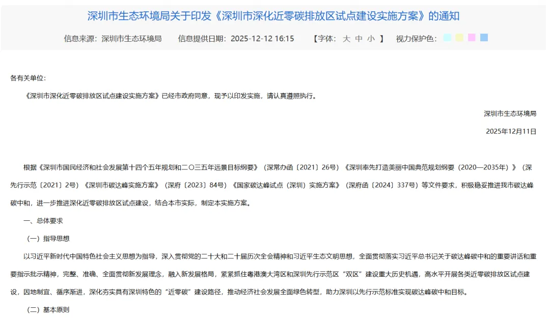 近日,《深圳市深化近零碳排放区试点建设实施方案》(以下简称《方案》)经深圳市政府同意正式印发实施。作为深圳落实国家碳达峰碳中和战略部署的核心举措,该方案紧密衔接《深圳市国民经济和社会发展第十四个五年规划和二〇三五年远景目标纲要》《深圳率先打造美丽中国典范规划纲要(2020—2035 年)》等重要文件要求,立足粤港澳大湾区和深圳先行示范区 “双区” 建设的重大历史机遇,构建了覆盖多领域、多层次、全链条的近零碳排放试点体系,为城市经济社会发展全面绿色转型注入强劲动力,也为全国同类城市探索近零碳发展路径提供了重要遵循。