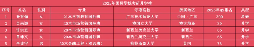 2025届国际学院就业率100%,连续三年居全校前列。2025届毕业生中,55.6%成功进入海内外高校攻读硕士研究生,升学率较2024届提升了23个百分点,其中被QS2025排名前100高校录取的比例达80%。