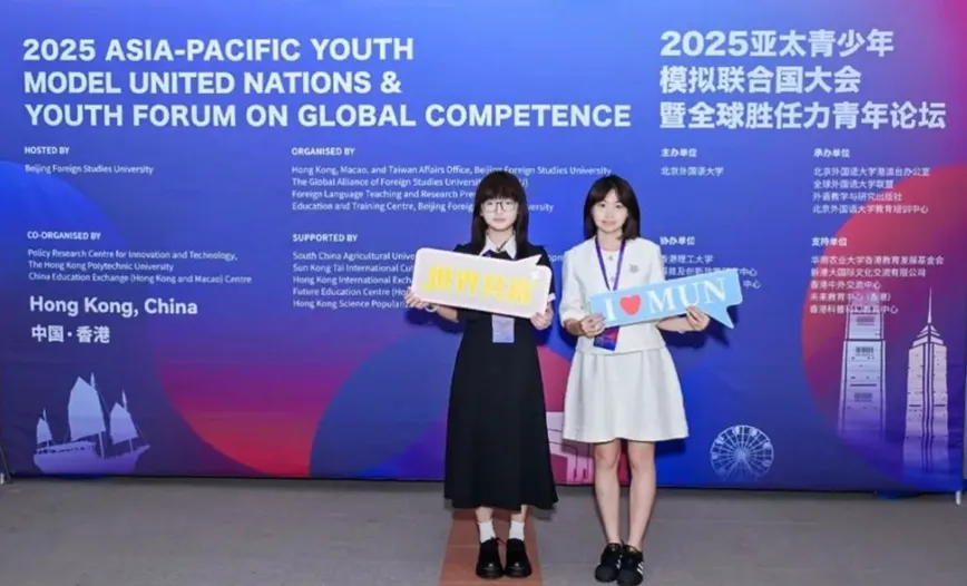 2025年7月14日至15日,国际学院23级会计国际班余意、汪宇宸赴香港参加全球胜任力青年论坛并发表演讲,同与会人员围绕联合国可持续发展目标(SDGs)探讨人类命运共同体建设路径。
