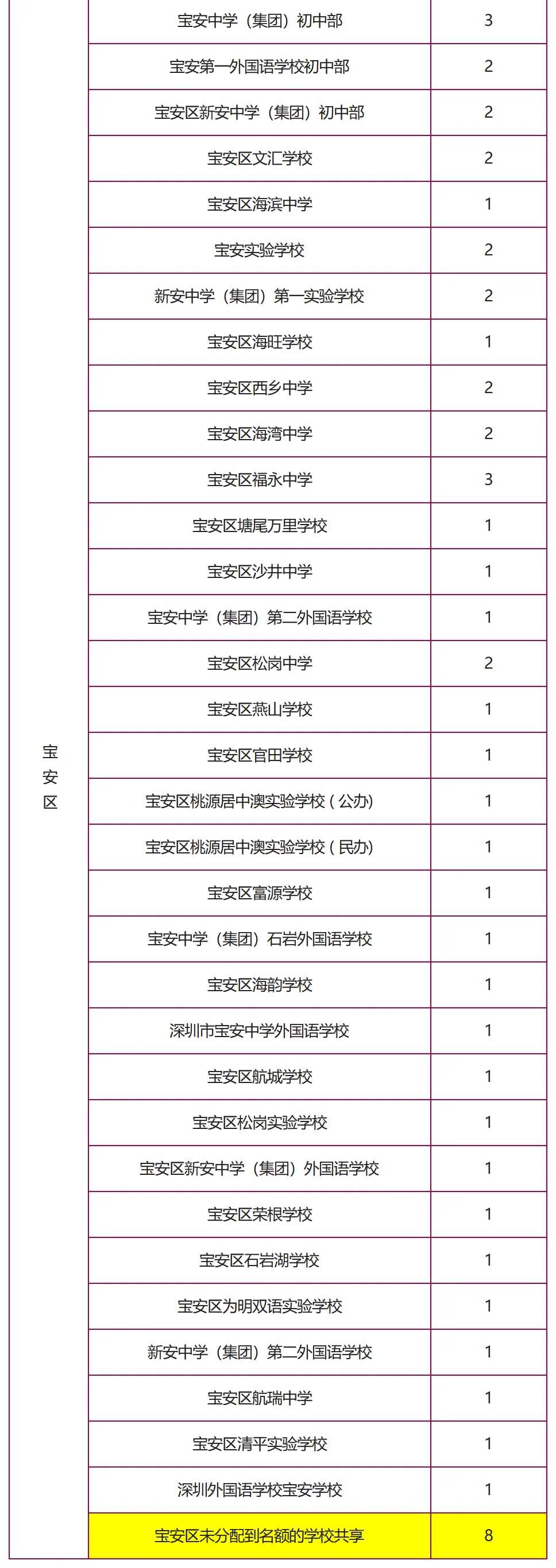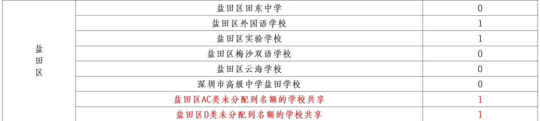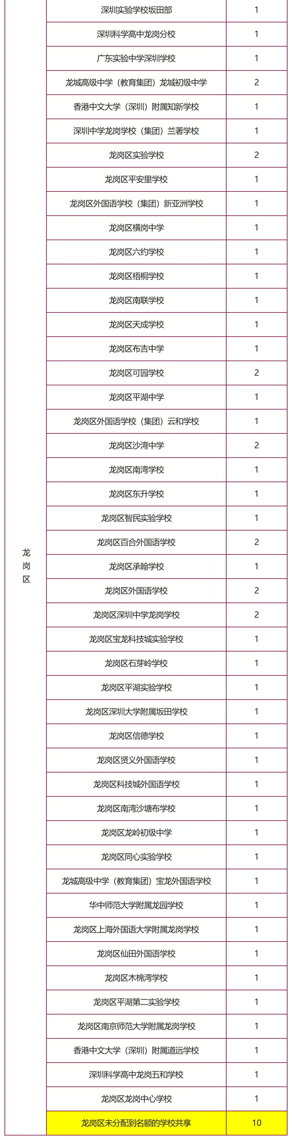 (表格中未列出初中学校为共享名额)