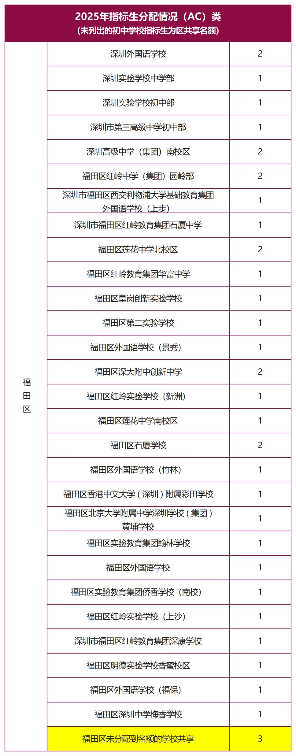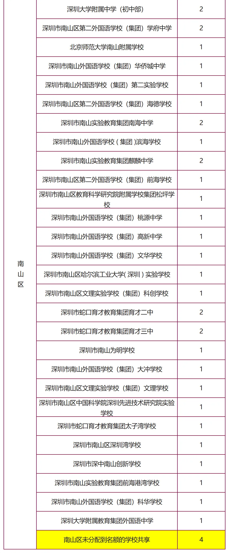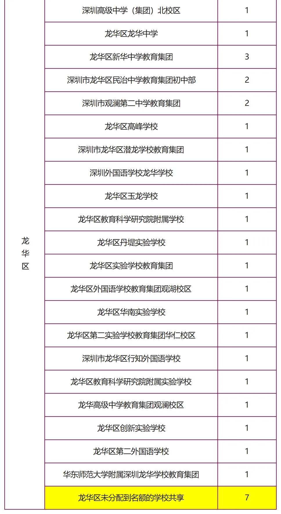 (表格中未列出初中学校为共享名额)