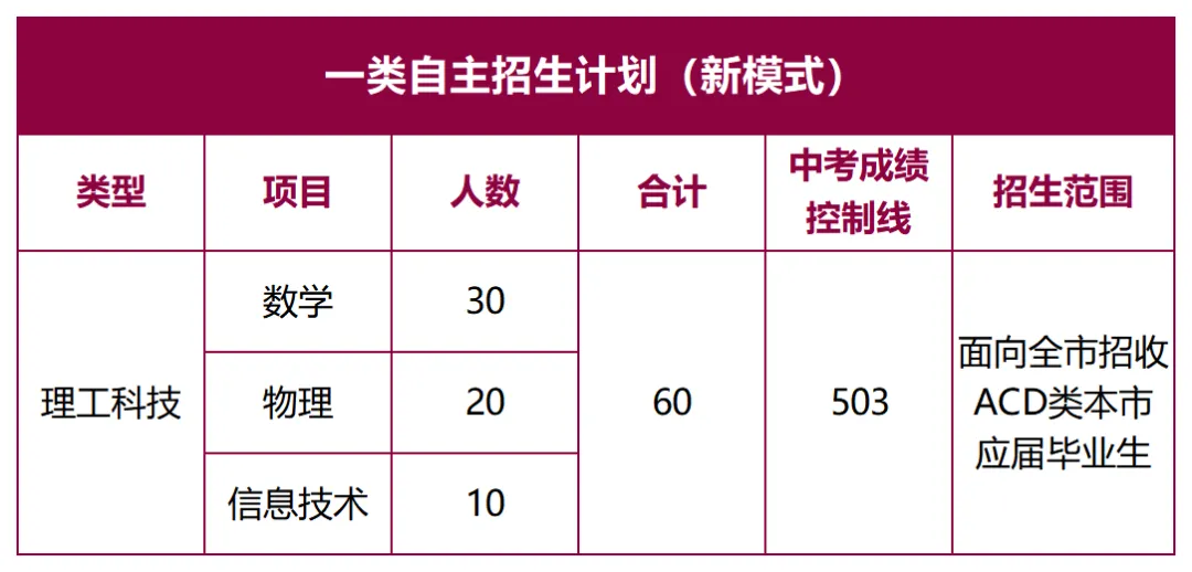 志向远大,社会责任感强,综合素质全面,学科知识扎实,表现优秀,在数学、物理和信息学科中成绩优异且具有创新意识与实践能力的ACD类本市应届初中毕业生。