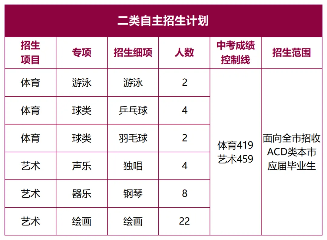 艺术(音乐、美术)自招考生入读单独分入艺术班(不得转班),且只有一个艺术班,该校的艺术培养方向是高端艺术院校。