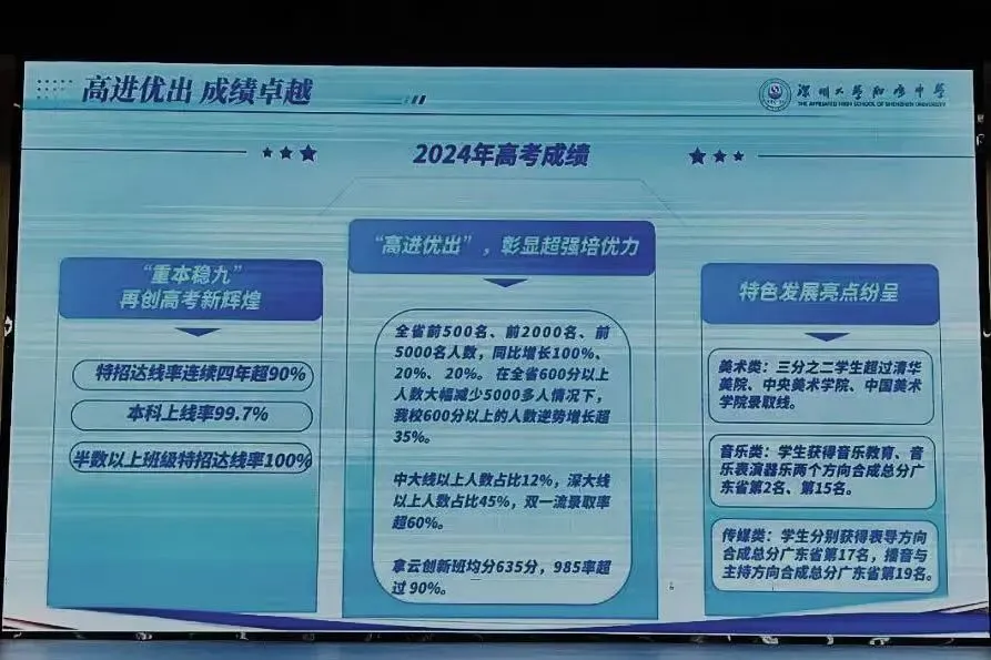 学校美术班素有“最牛美术班”之称,成绩持续领先:在2023年美术联考中,平均分位列深圳市第一;2024年高考,美术类最高分达267分(满分300分),平均分240分。
