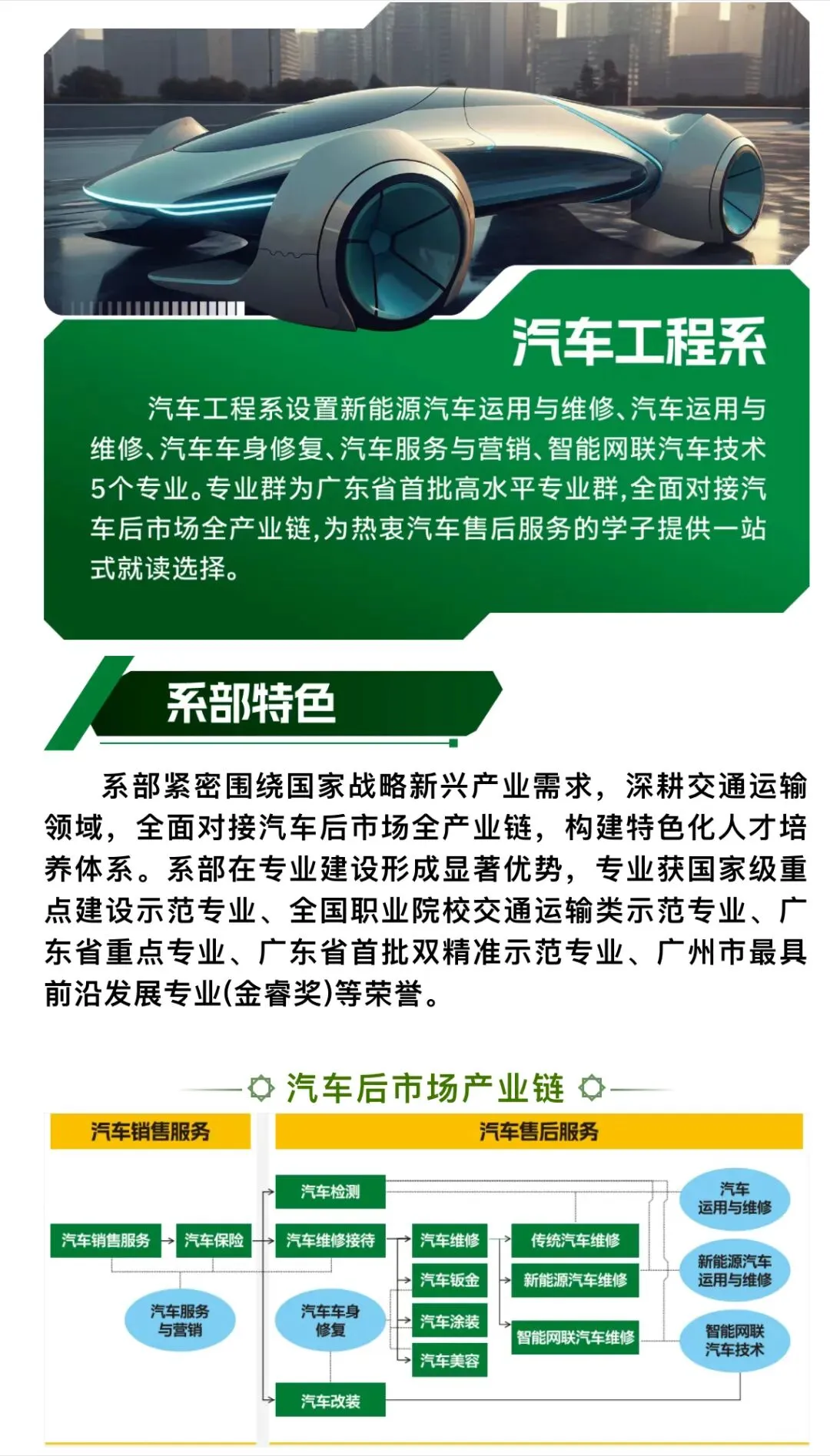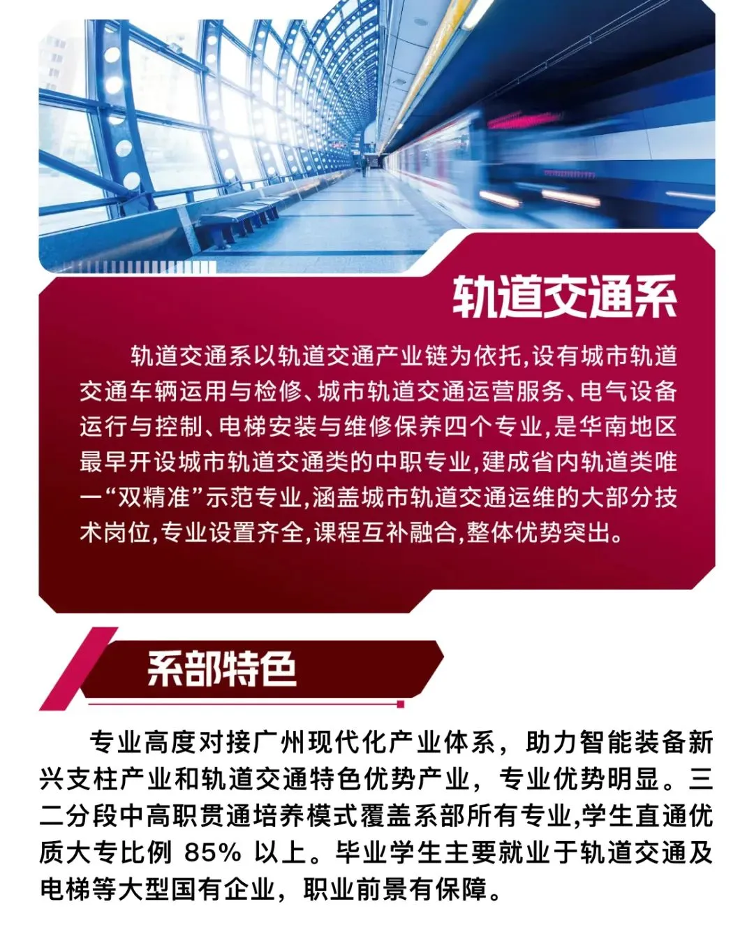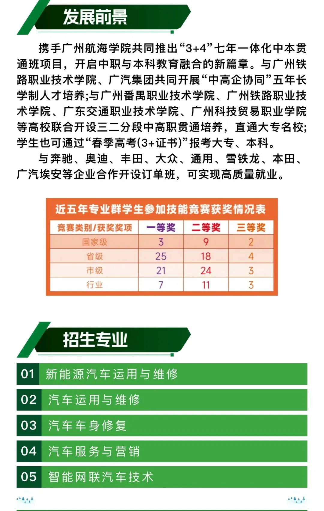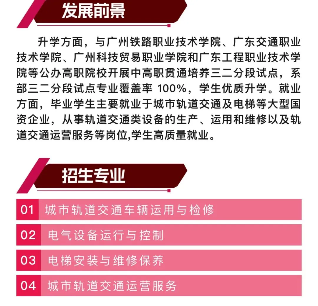 培养方式:前三年中职学段课程考核合格,符合转段条件并符合当年广东省高考报名条件,可进入对口高职院校的对口专业继续学习两年,学生毕业后可获得全日制大专学历。学校与广州铁路职业技术学院、广汽埃安及广汽乘用车有限公司创建“中高企协同培养五年长学制”试点班,该班五年均在中职学校学习,学生毕业后可获全日制大专学历,以及优先推荐到奔驰、奥迪、丰田等优质企业就业。