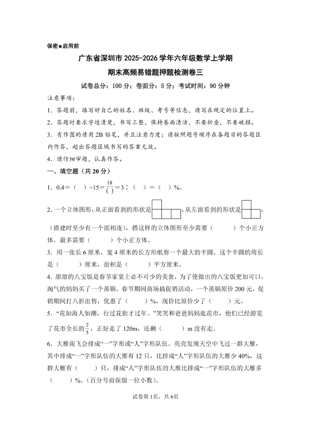 本卷作为六年级期末测试,填空题前5题的基础概念判断和计算题是主要得分点,考查学生对分数运算和图形变换等基础知识的掌握;难点在于第7题的圆周长变化分析和第29题的外圆内方面积计算,特别是第26题的比例应用题对学生的逻辑推理能力形成挑战,体现了数学学科的数感、几何直观和数据分析核心素养。