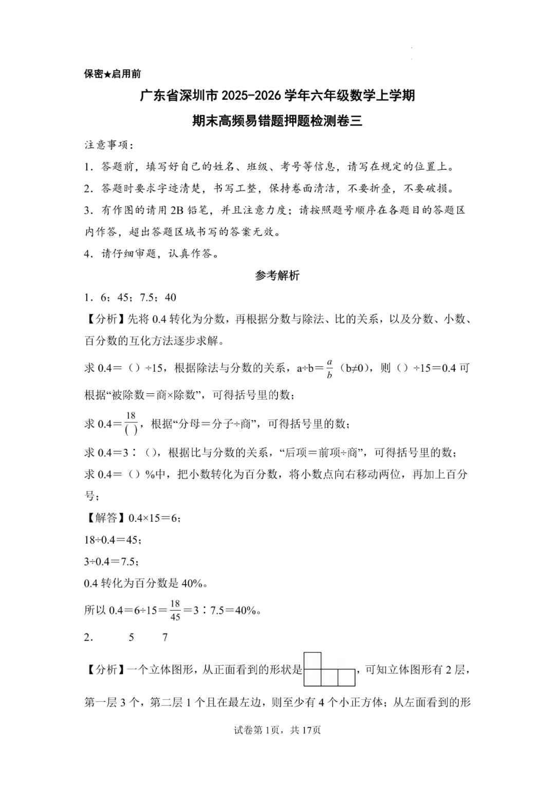 广东省深圳市2025-2026学年四-六年级上学期数学期末押题卷(三)