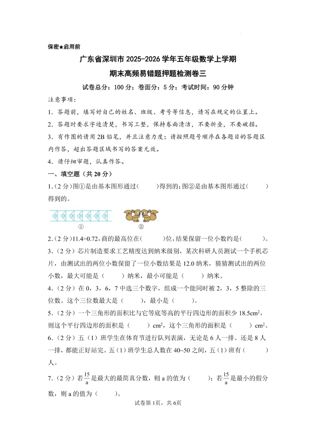 本卷作为五年级期末测试,填空题前5题的基础概念判断和计算题是主要得分点,考查学生对小数运算和图形面积等基础知识的掌握;难点在于第8题的组合图形面积计算和第30题的概率策略分析,特别是第26题的实际问题建模对学生的空间想象和数学应用能力形成挑战,体现了数学学科的数感、几何直观和数据分析核心素养。