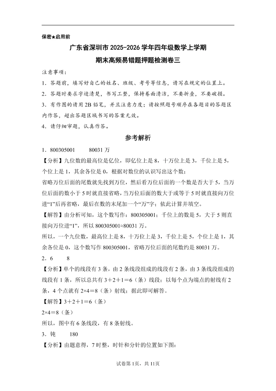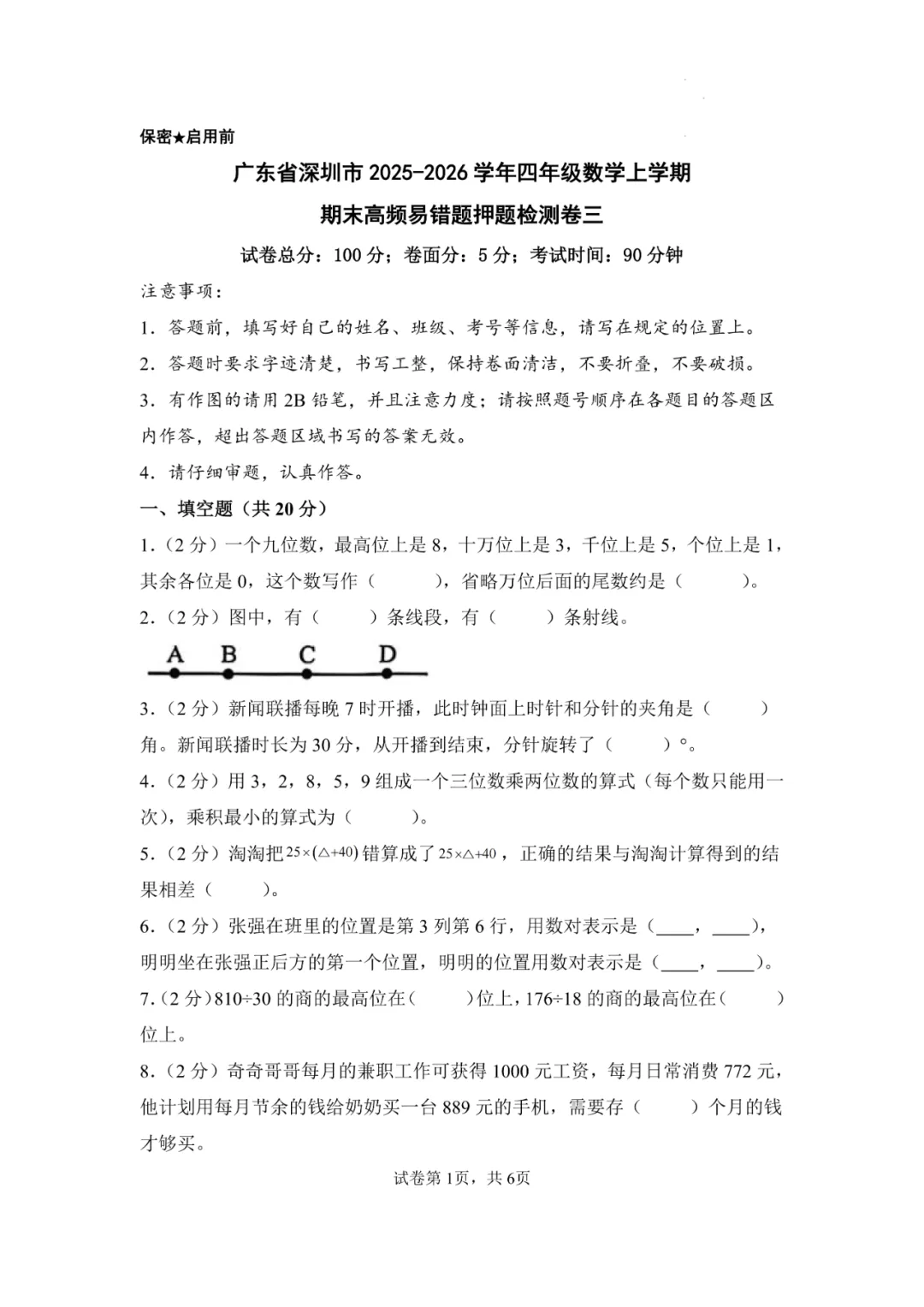 本卷作为四年级期末测试,填空题前6题的基础概念判断和计算题是主要得分点,考查学生对大数读写和四则运算等基础知识的掌握;难点在于第4题的乘积最小组合和第25题的折叠角度计算,特别是第29题的坐标与方向综合应用对学生的空间想象能力形成挑战,体现了数学学科的数感、几何直观和数据分析核心素养。