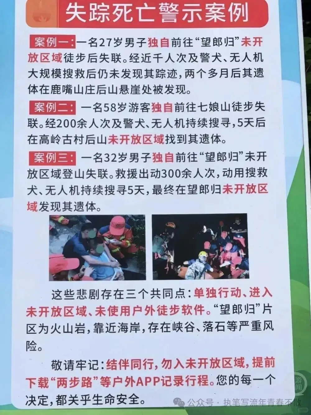 这些事故均发生在“望郎归”未开放区域,该区域地形复杂、缺乏救援设施,存在峡谷、落石等风险。自2023年以来,公园管理处已参与救援行动229起,多起事故因游客独自进入未开放区域、未做好安全准备导致。