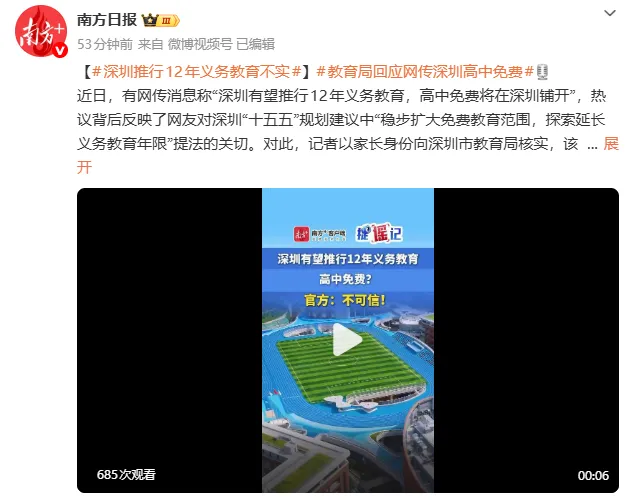 对此,南方日报记者以家长身份,就网传“深圳推行12年义务教育、高中免费”的相关信息,向深圳市教育局进行核实。