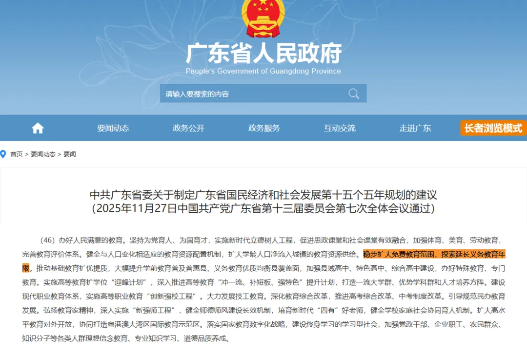 12月8日,广东也在“十五五”规划建议中明确:稳步扩大免费教育范围,探索延长义务教育年限。