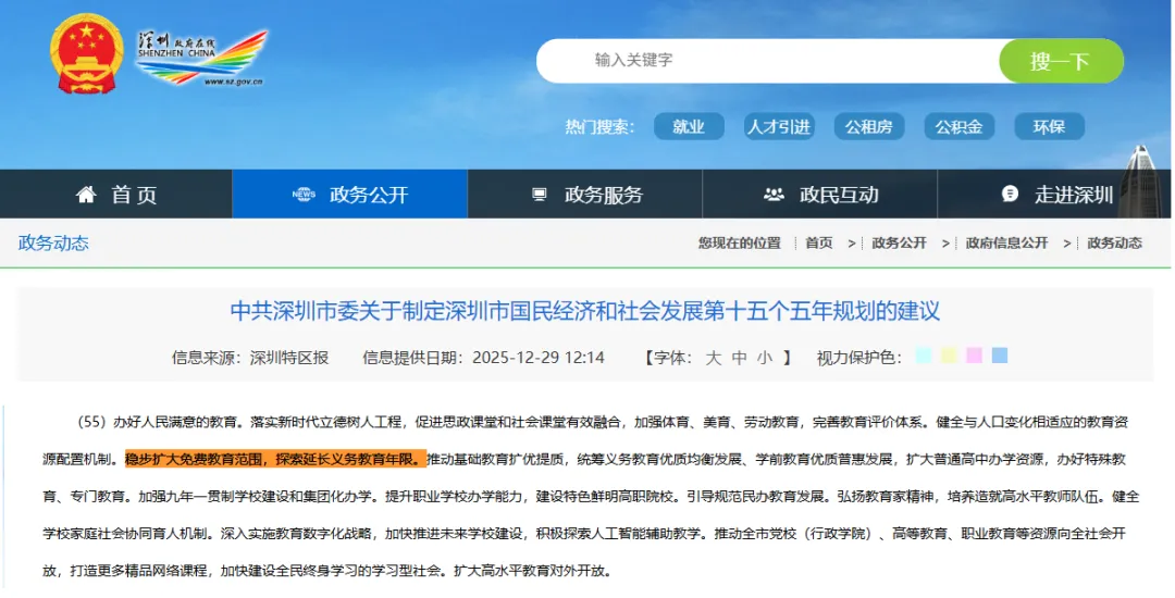 12月29日,深圳“十五五”规划建议出台,其中也明确:稳步扩大免费教育范围,探索延长义务教育年限。