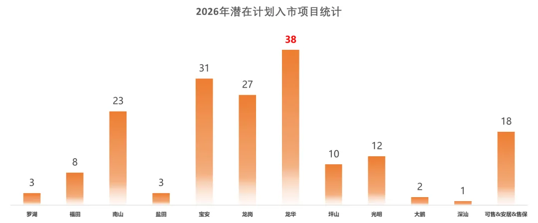 2026年,龙华预计推售约38个含住宅项目,正式超越长期占据榜首的龙岗,成为深圳新房供应的“头号主力”,供应主要集中在民治-红山-上塘和观澜两个大板块。在产品类型上,新规楼盘占据主导地位,包括鸿荣源宸玺花园、新澍雅居、深业上宸瑞府、安澜雅苑等项目。与此同时,部分产品仍在持续推新,如塘城壹号、天湖岛花园、深铁珑境二期等。从入市节奏看,多个项目进展迅速,像龙华中心的金地启曜已开发样板间,预计1月中旬就会入市;民治-红山-上塘板块的新国标楼盘联发新澍雅居、去年的土拍地块中海云颂玖章预计1季度入市;观澜除了鸿荣源观城预计将会一季度加推外,玖珑瑧境也预计同期首次入市。此外,比较受关注的楼盘还有梅林的深国际华南物流园、去年上塘的土拍地块深业上宸瑞府/上宸华府、民治板块的中交国润华府都已经在建设中,快的话预计在2026年上半年取证入市。2023年12月28日,深圳官宣首批集中开工13个配售型保障房,涉及福田、南山、宝安、龙岗、龙华、坪山、光明7区。
