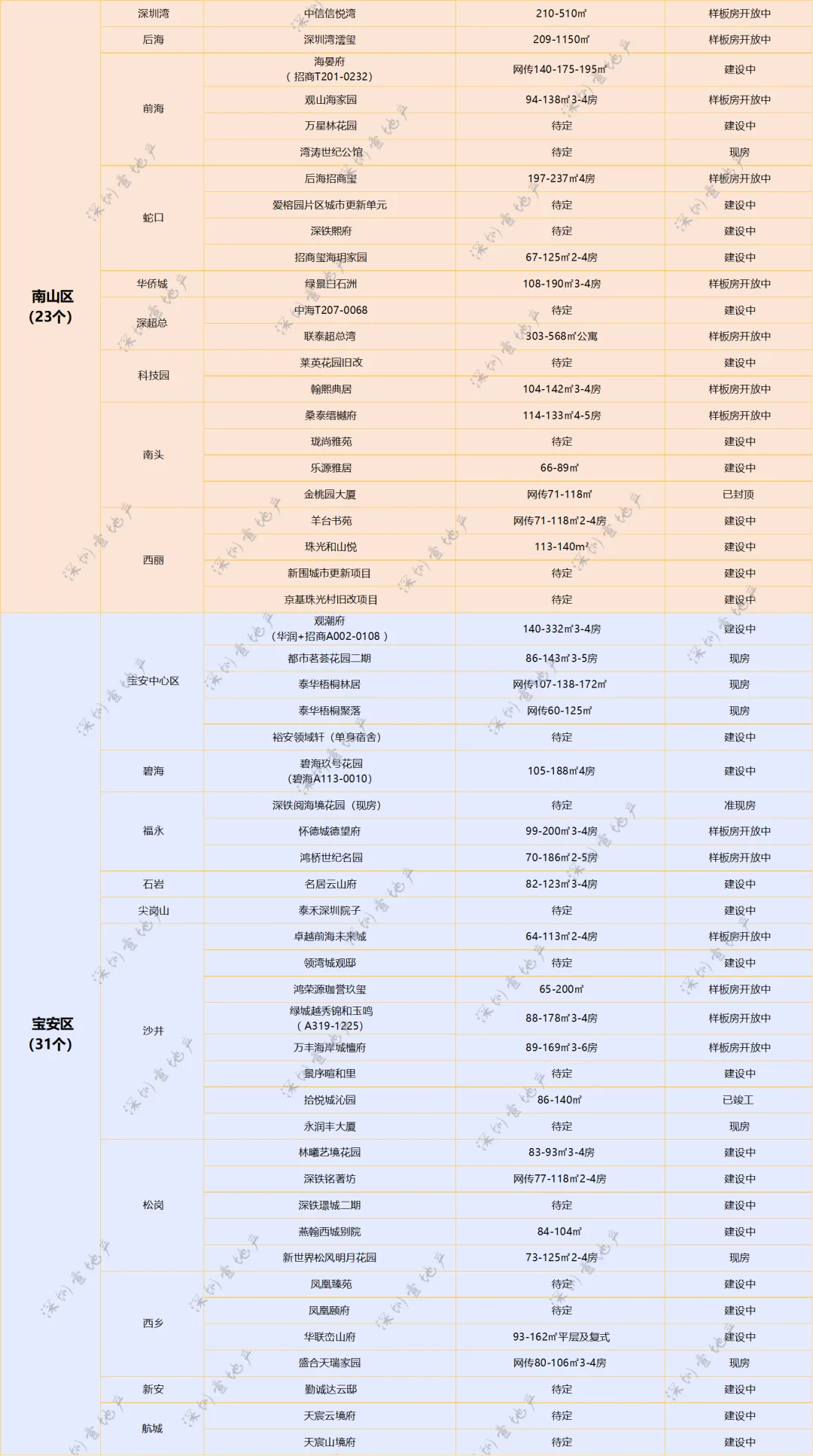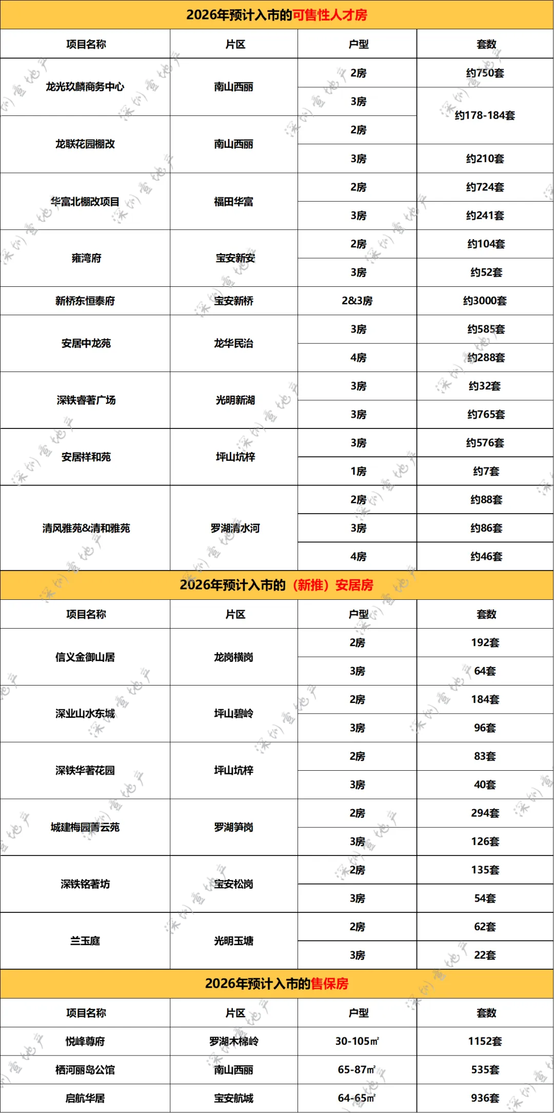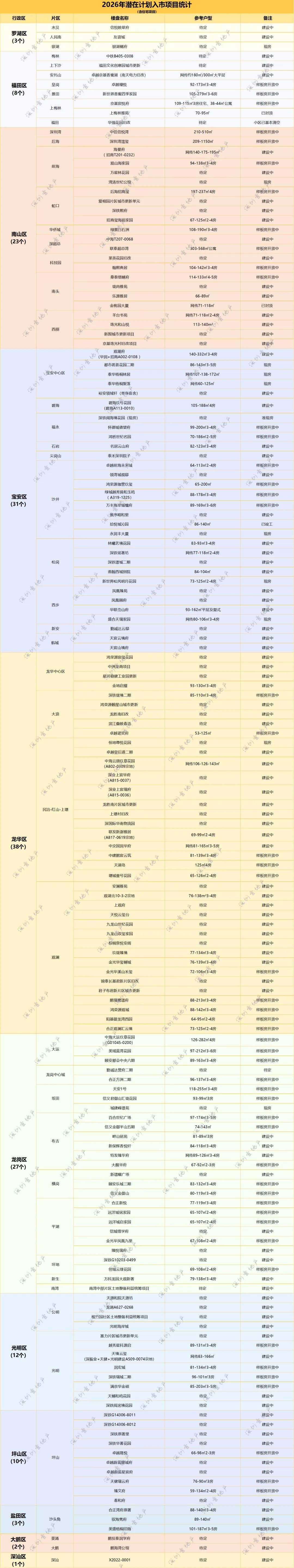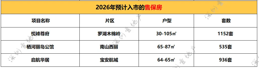 因为价格优势,一直是许多买房人关注的重点,据壹地产不完全统计,今年预计将有3个售保房入市。从建设进度来看,最快的是罗湖的悦峰尊府项目,当前已经是现房状态,户型跨度比较大,在30-105m²之间,据网传共有12个户型可供选择;其次是南山西丽的栖河丽岛公馆,当前已经全面竣工。该项目靠近大学城和西丽水库,生态环境非常优越,预计最快2026年底就能入市推售;最后是宝安的启航华居,该项目在107国道旁边,之前有爆停工,但2025年初就已经恢复施工,如果进展顺利的话,预计也将在今年年底达到入市标准。需要特别说明的是,配售型保障房的正式上市仍需等待相关配套政策落地,具体配售时间、申请条件及流程,均以官方公告为准。当然,除了上述提到的区域之外,福田、龙岗、光明等区域在新房市场中也各有亮点。像福田虽不是供应大户,但因为优质的地理位置,仍有一批高关注度项目入市。除了卓越缦悦、香蜜四季家园将持续推新外,去年让8家房企鏖战148轮的梅林B405-0308地块预计或将于今年入市,还有期待多年的卓越京基香蜜湖,预计将于2026年二季度左右入市。值得一提的是,福田在去年还有十亩地、香蜜湖度假村等多处优质地块腾出,虽说目前还没有确定地块性质,但值得期待。龙岗今年虽然退居二线,仍有一些备受关注的楼盘。如去年土拍地块G01045-0200中海大运玖章花园,今年还会持续加推;城建峰璟苑、信义君御山汇珑等已经是现房/准现房状态;新霖瑧邑、特发臻华府开发节奏较快,预计2026年第一季度左右面世,户型以刚需及刚改为主,性价比突出。光明去年两个土拍的地块均有不同的进展,龙湖A627-0268地块已平整完毕,打桩机已进场,6月可能入市销售;深振业+天健+光明建设A509-0074宗地已命名为天境云玺,是光明首个新国标大盘,预计将于2026年第二季度取证并开盘入市。接下来,壹地产将针对今年深圳楼市中备受关注的热门新盘展开深度踩盘,如去年集中出让的12宗宅地的最新开发进度,感兴趣的朋友,记得持续关注,别错过第一手干货!注意:为提高深圳业主的入群体验,群组不允许添加新成员和发布无用的广告。非免费,需审核,不欢迎同行、中介加入。混入群组搞客户的人,终生不会与其合作。如果您想与我们团队合作,请扫描二维码添加我们的微信。平台欢迎广大房地产及其他行业从业者的合作,但不欢迎私自混入群组搞客户的人。第一次在深圳买房?头脑毫无头绪?不知道怎么选楼盘?也不知道怎么选户型?怎么卖房以及置换房产?如何通过法拍买房捡漏...