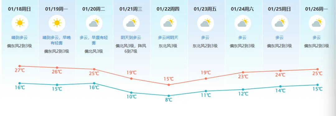 预计我市18-20日白天晴到多云,早晚有轻雾;